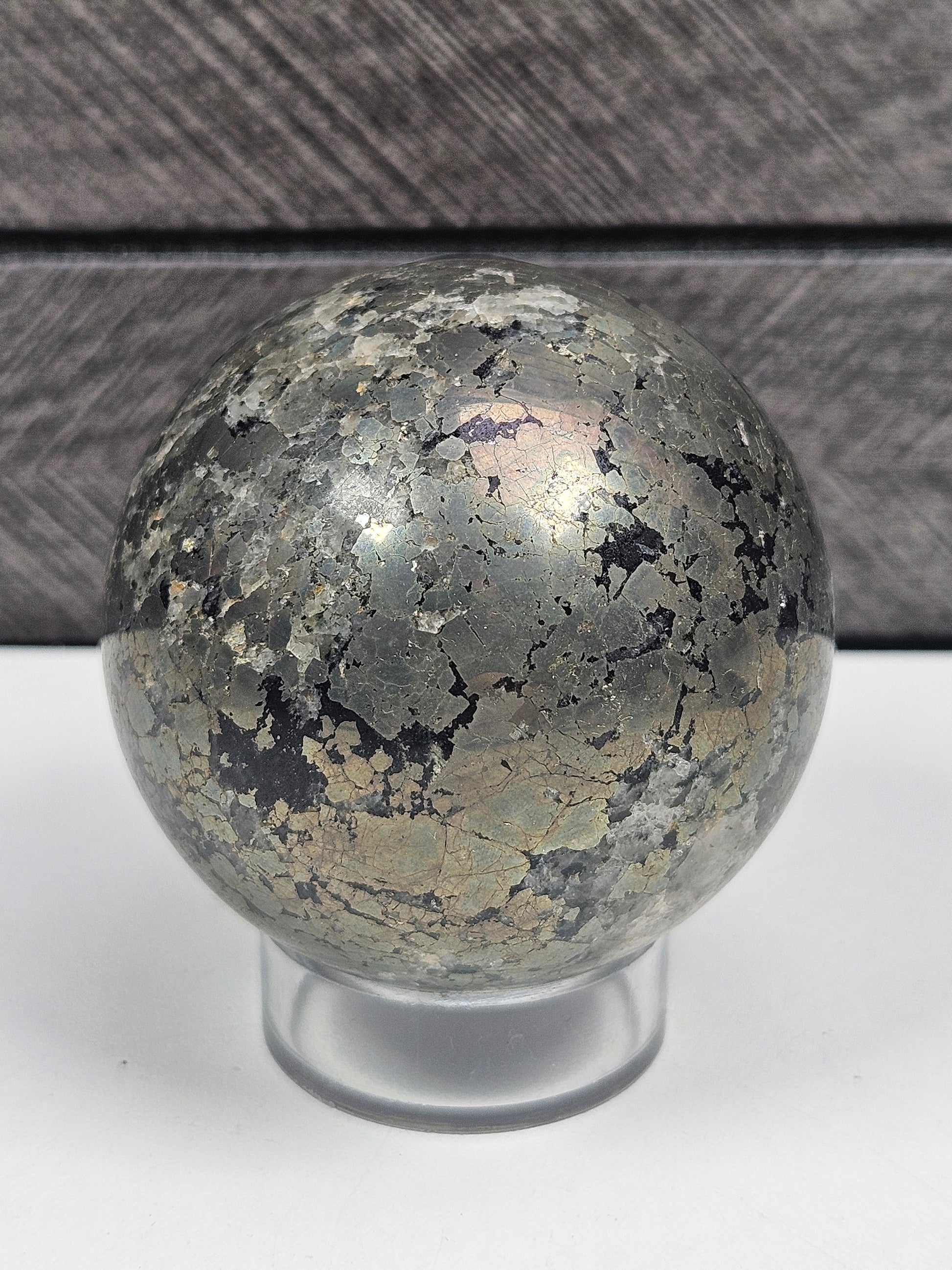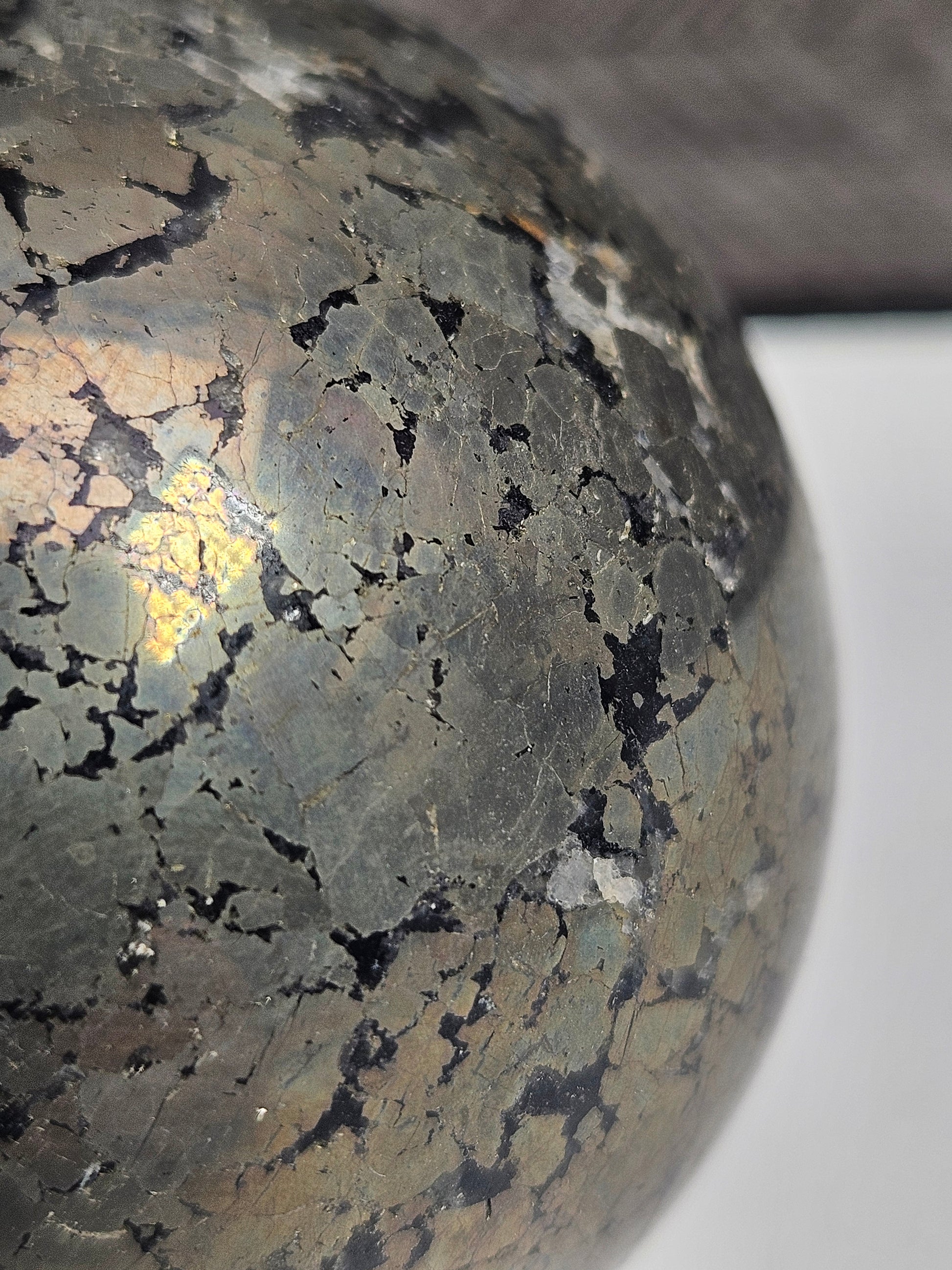 Deze Pyriet bol van 350 gram is een bijzondere aanvulling op het assortiment van Stenen Heksje en een mooie keuze voor liefhebbers van krachtige, beschermende edelstenen.
