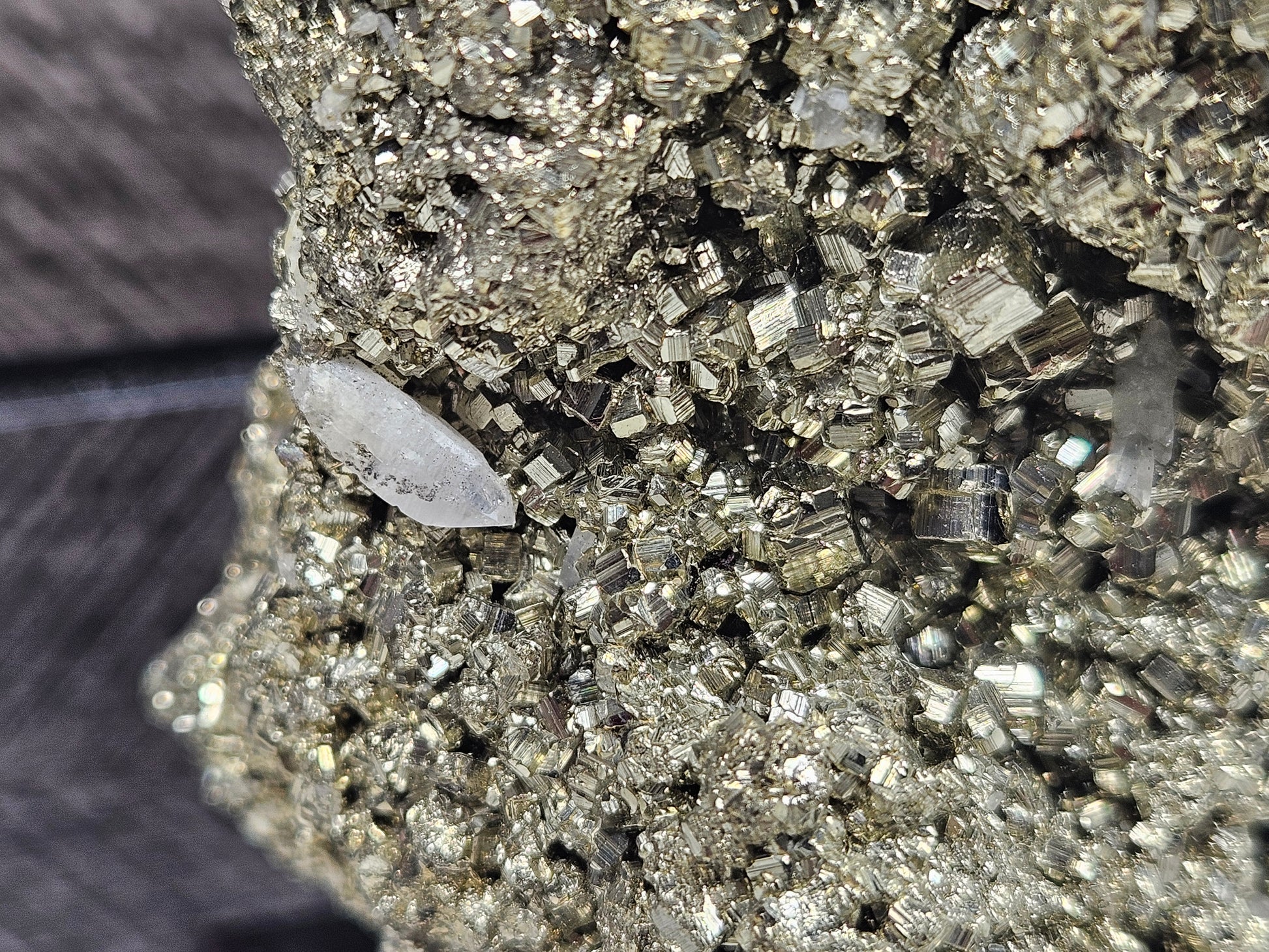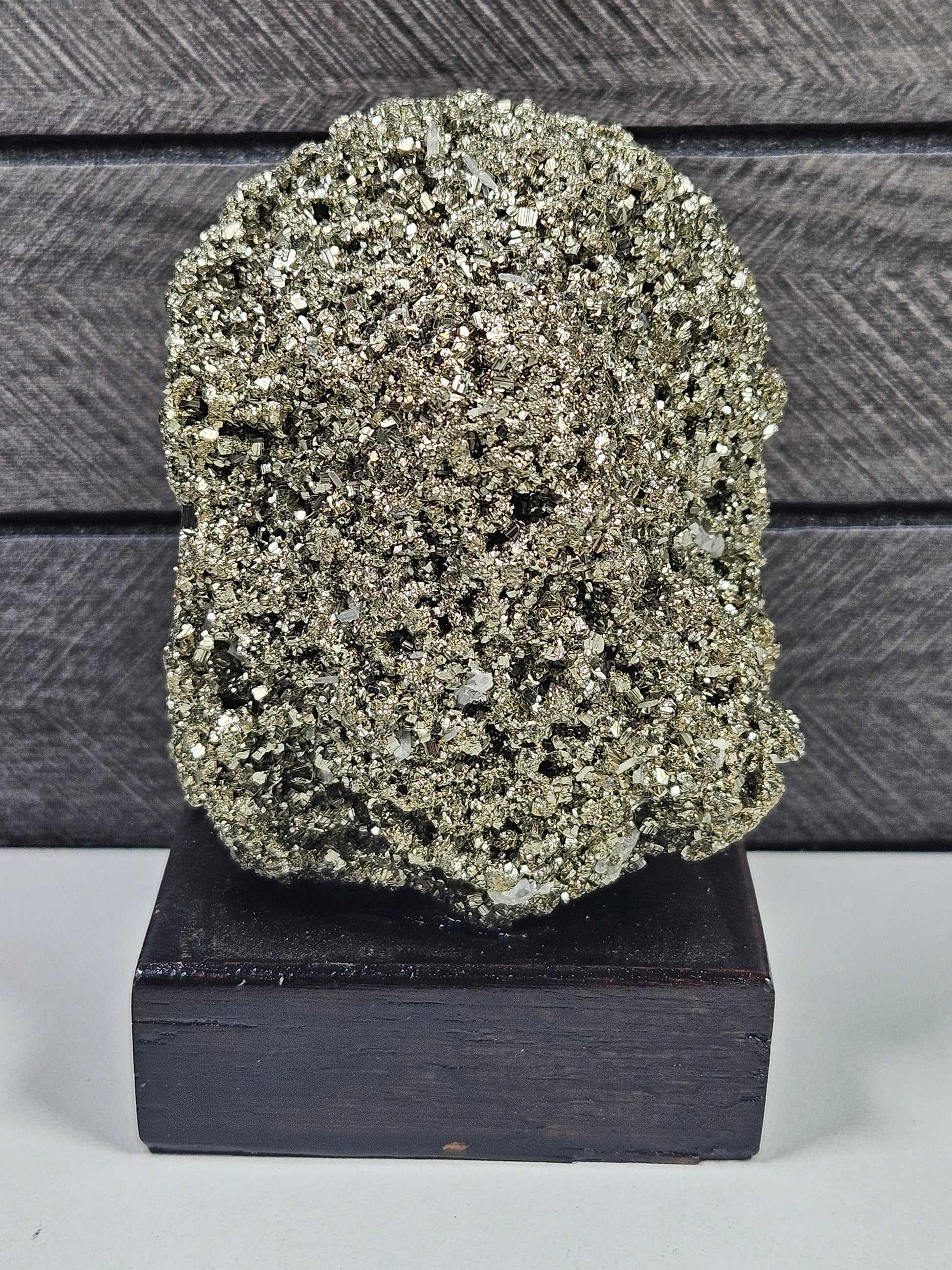 Deze indrukwekkende pyriet met kwarts op houten basis is een krachtig en decoratief mineraal met een prachtige combinatie van goudkleurige metallic glans en heldere kristalstructuren. Met een gewicht van 576 gram, een hoogte van 11 cm en een breedte van 6 cm is dit stuk een echte blikvanger voor je interieur, werkplek, altaar of edelstenencollectie.