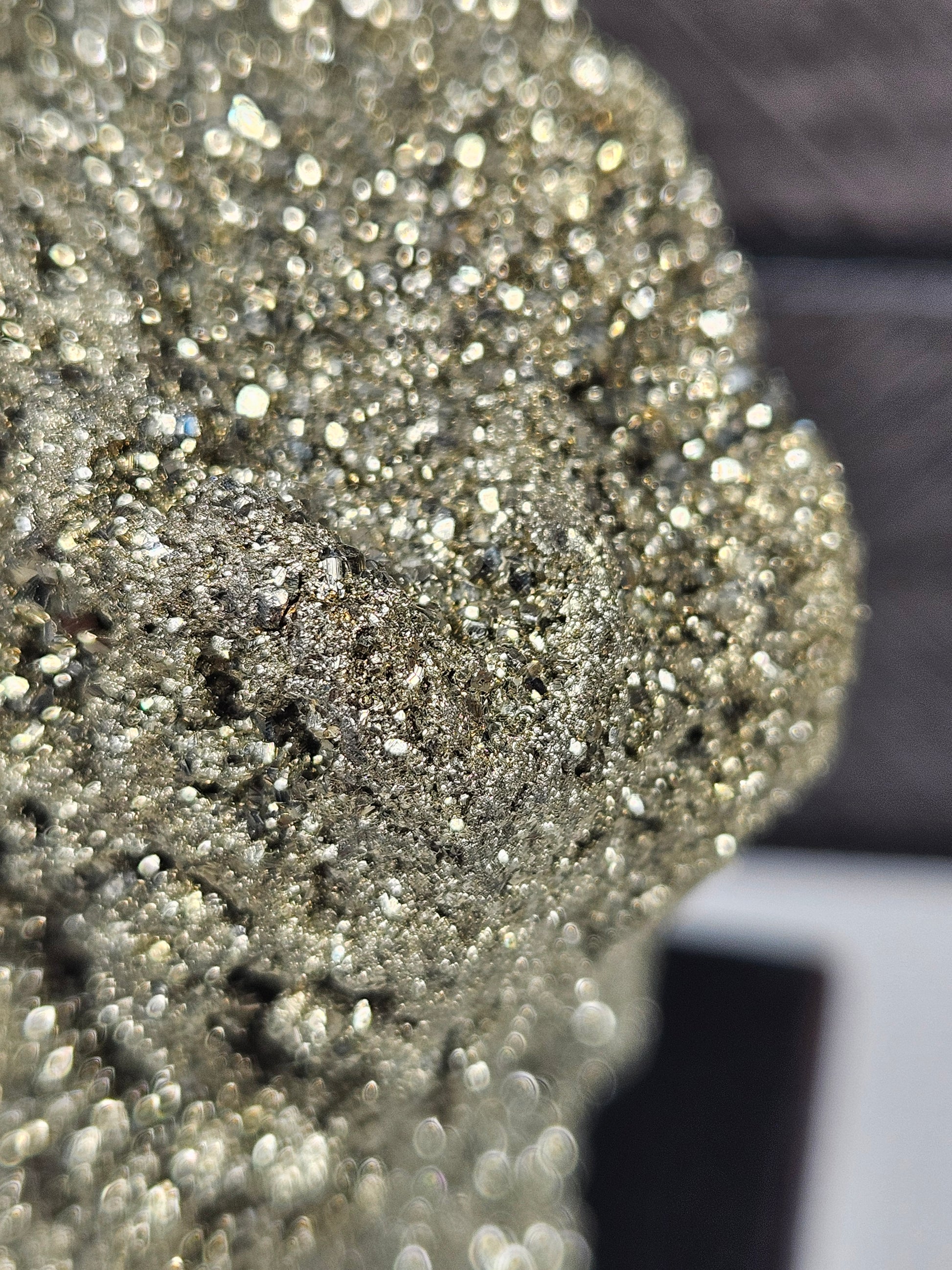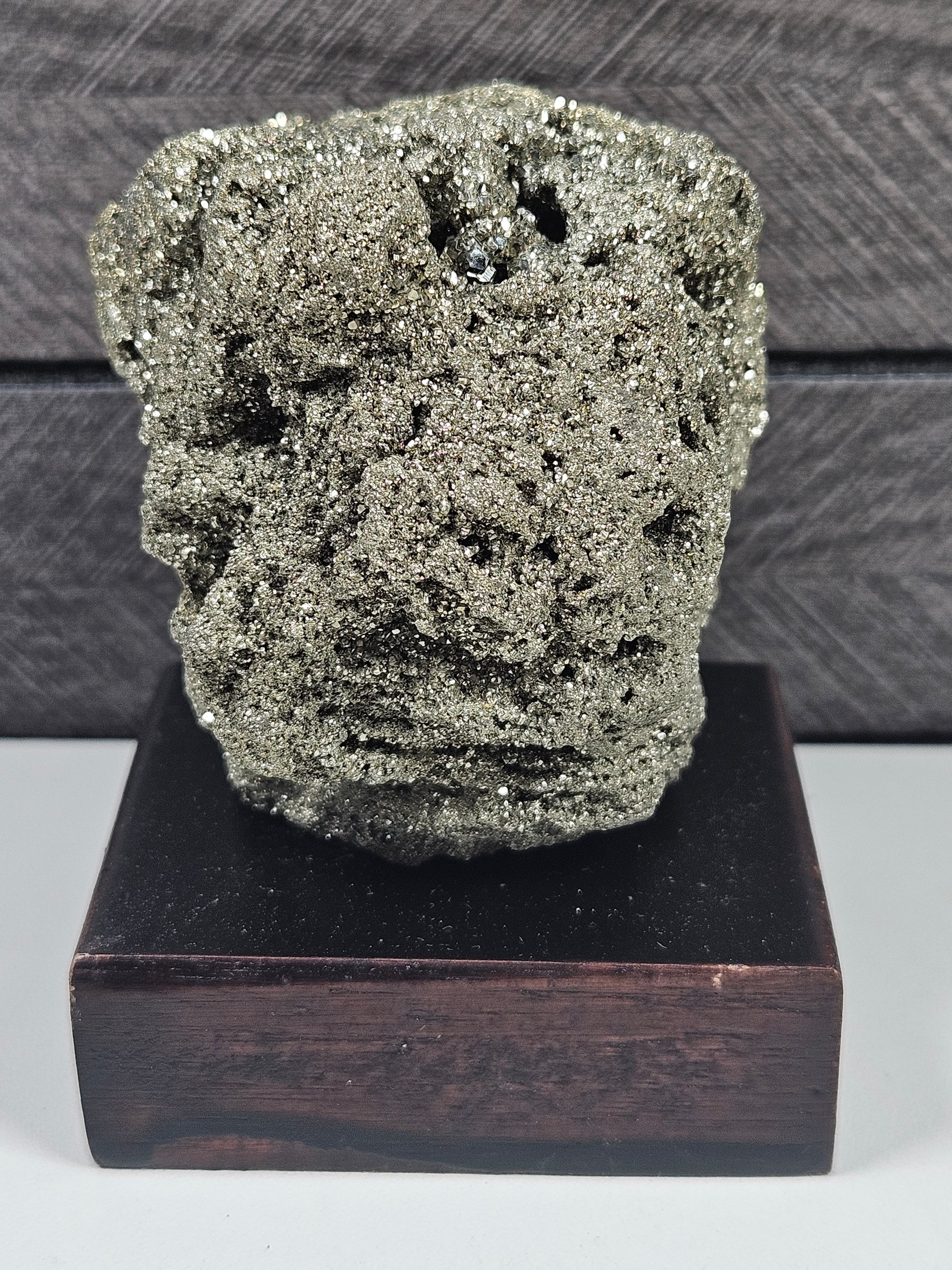 Deze indrukwekkende pyriet op houten basis is een krachtig en decoratief mineraal met een schitterende goudkleurige metallic glans. Met een gewicht van 362 gram, een hoogte van 8 cm en een breedte van 6 cm is dit stuk een compacte maar karaktervolle blikvanger voor je interieur, werkplek, altaar of edelstenencollectie.