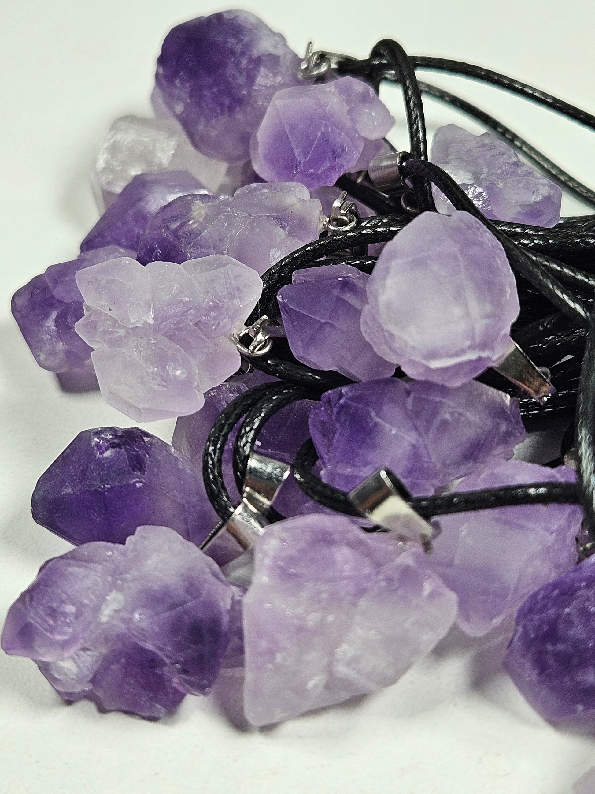 Dit betreft unieke artikelen. De ruwe amethist hangers verschillen onderling in vorm, grootte en kleurintensiteit, zoals zichtbaar op de foto. Je ontvangt één willekeurig exemplaar van vergelijkbare kwaliteit en uitstraling.