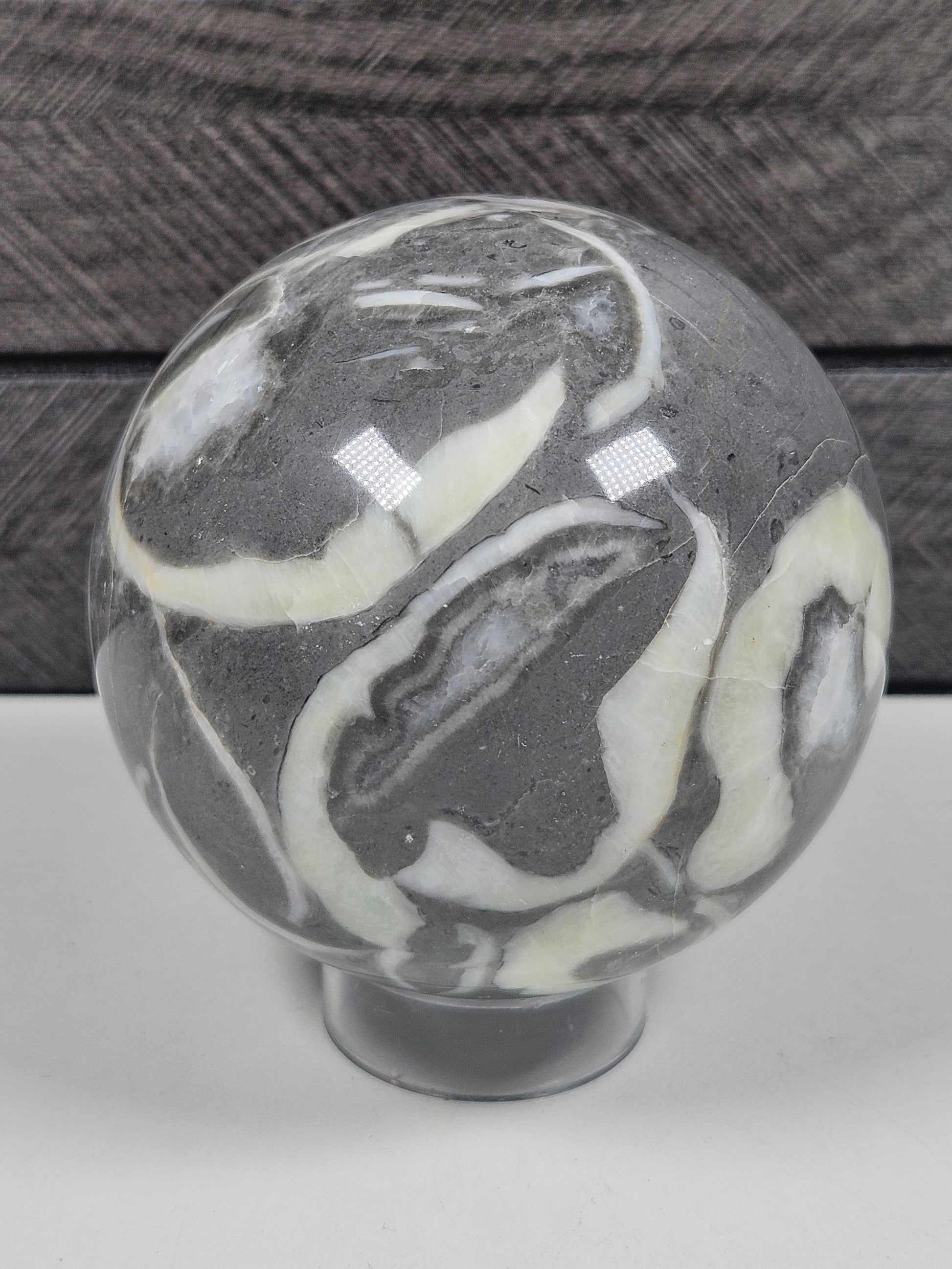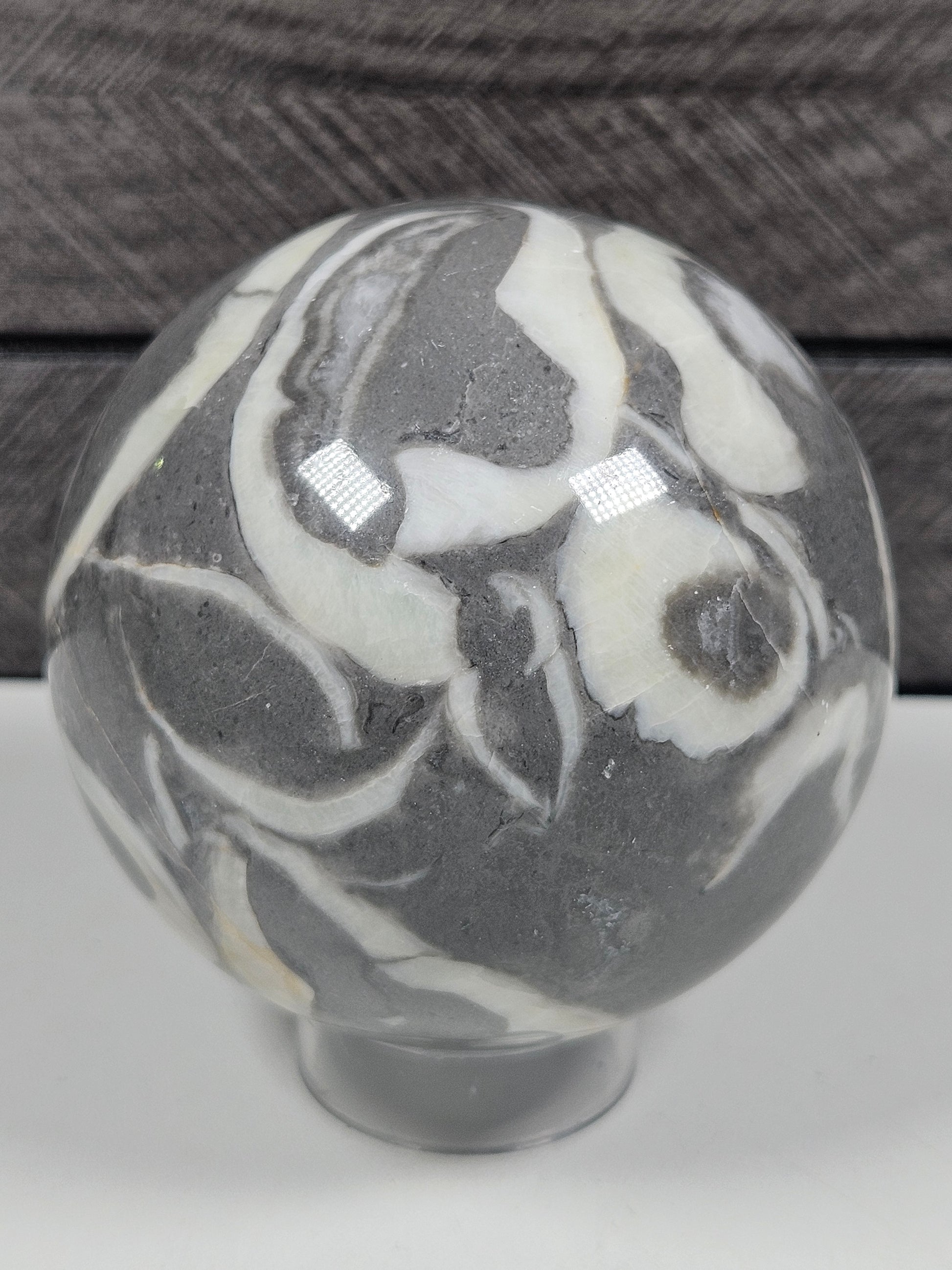 Deze prachtige sea shell jaspis bol heeft een unieke en natuurlijke uitstraling met bijzondere patronen die doen denken aan schelpen en oceaanstructuren. De steen toont een speels samenspel van zachte, aardse tinten en organische vormen, wat zorgt voor een rustgevend en harmonieus geheel. Door de bolvorm komt deze bijzondere tekening vanuit elke hoek mooi naar voren, wat dit stuk extra decoratief maakt.