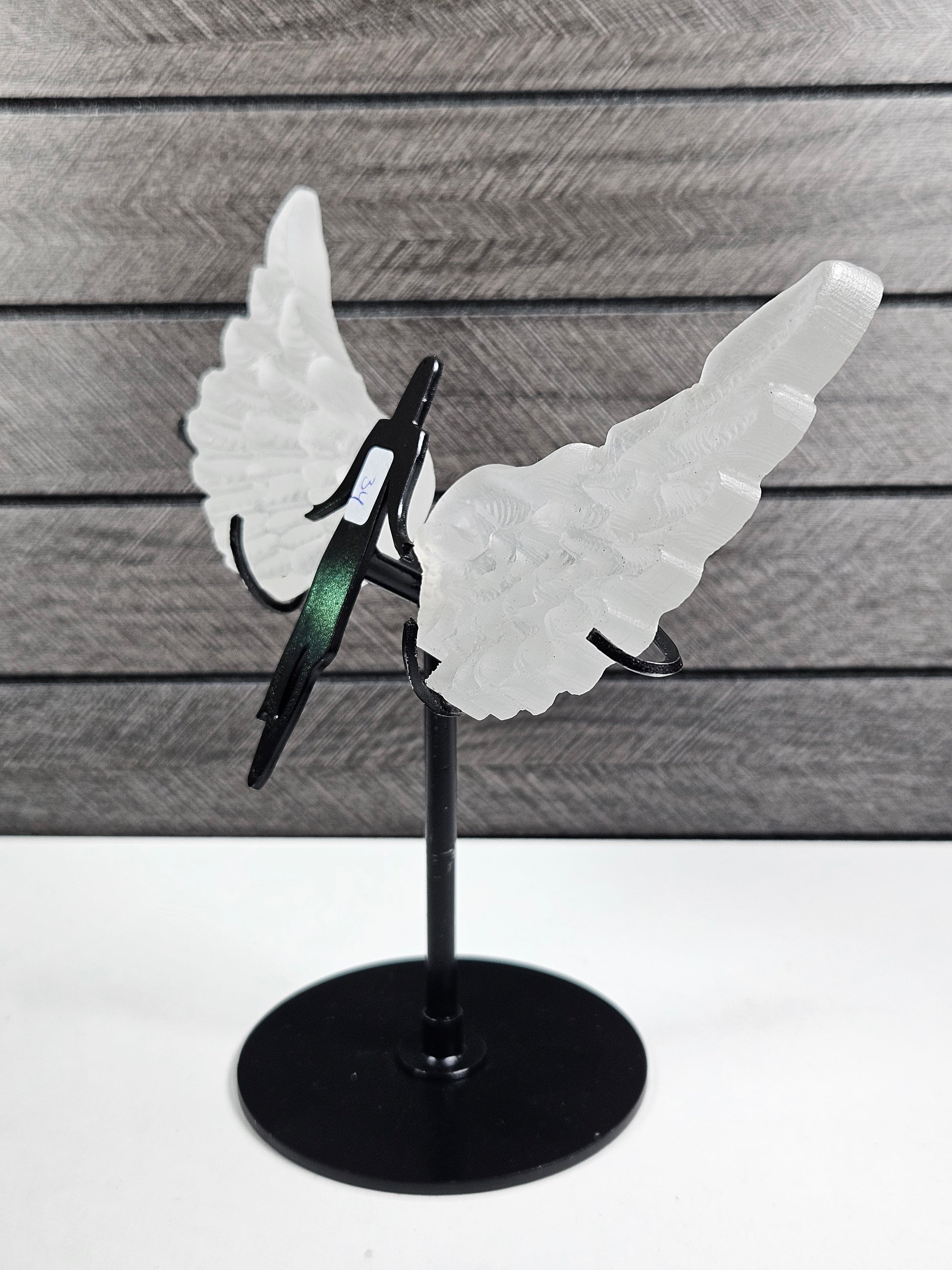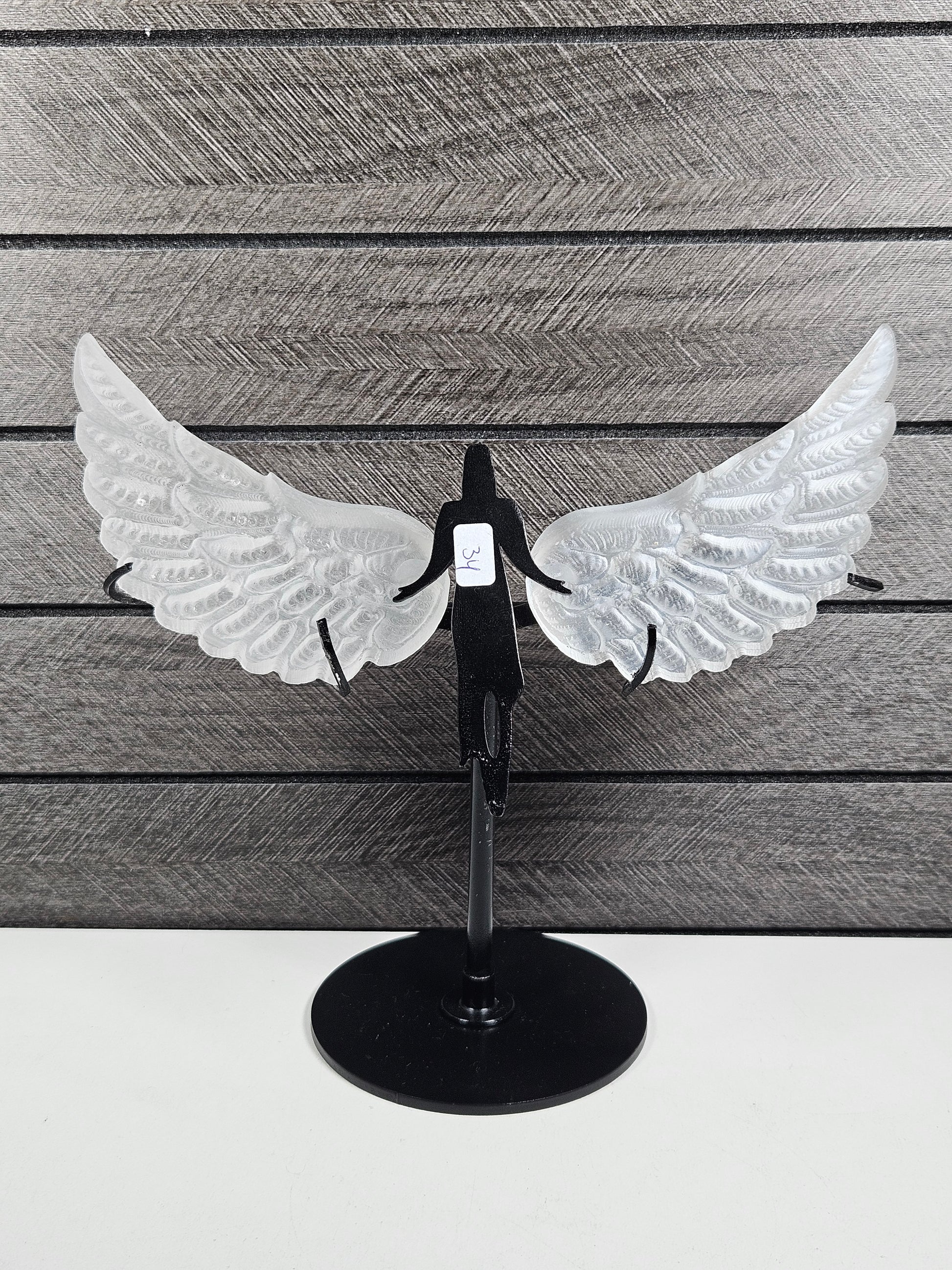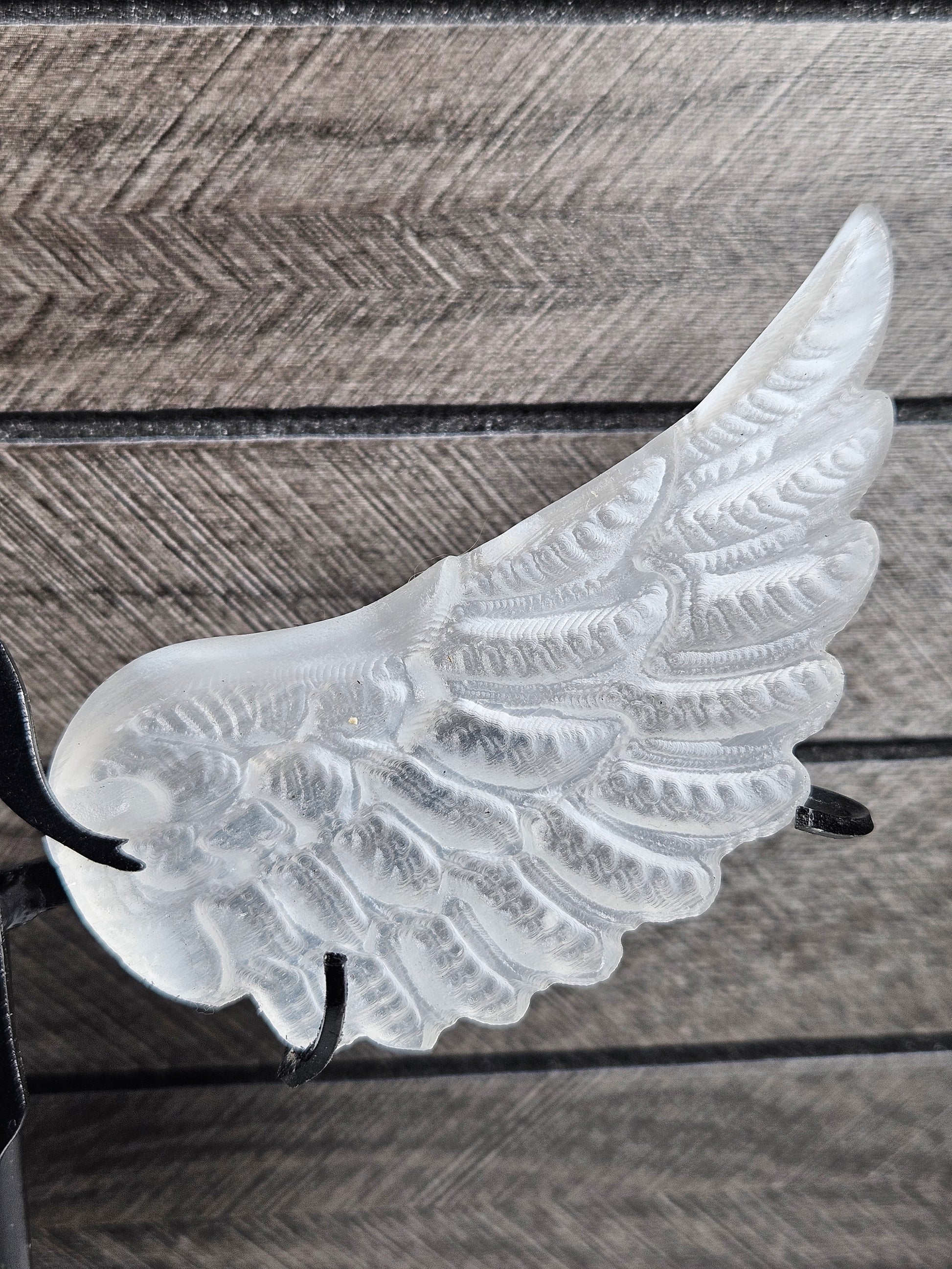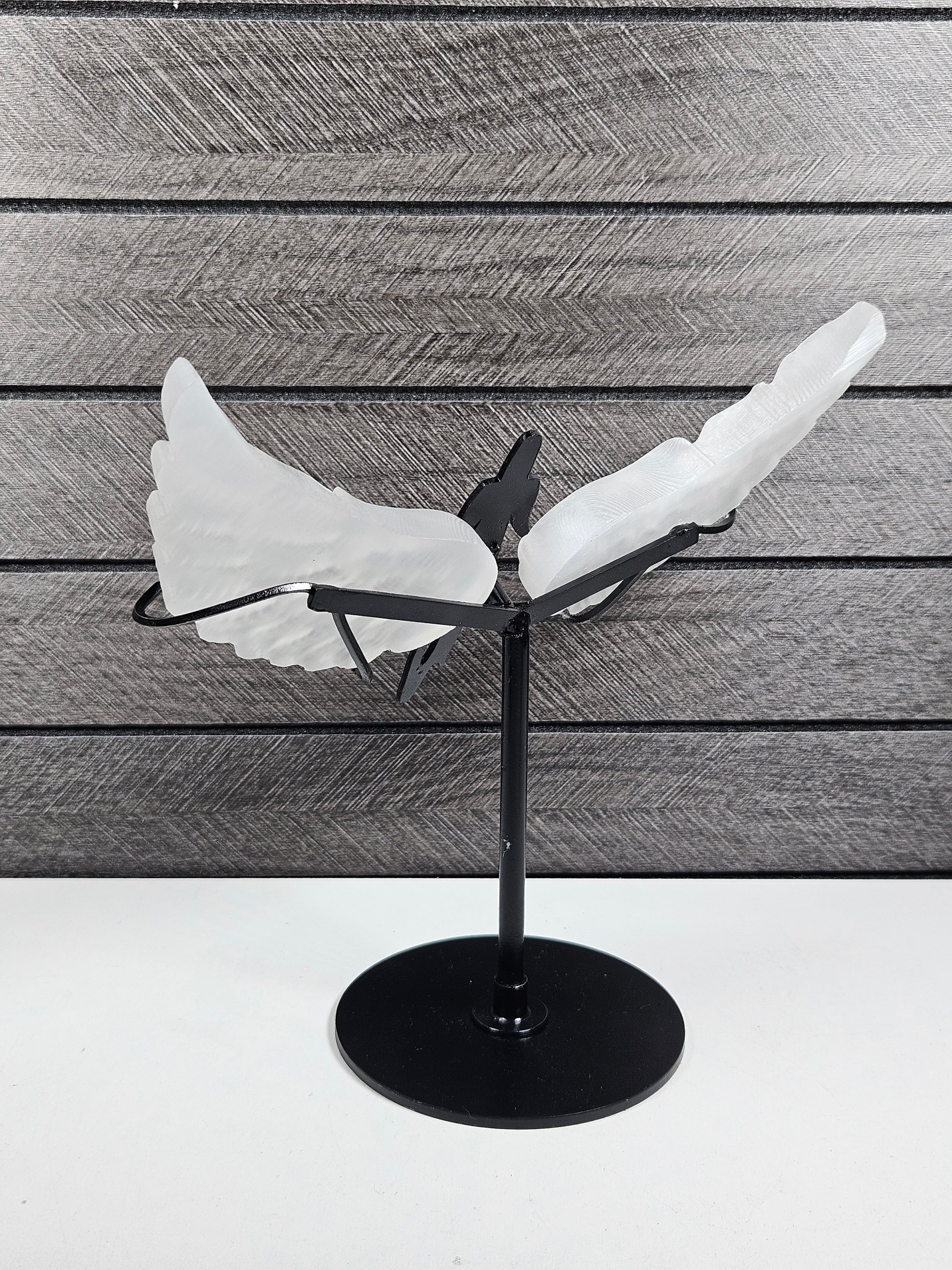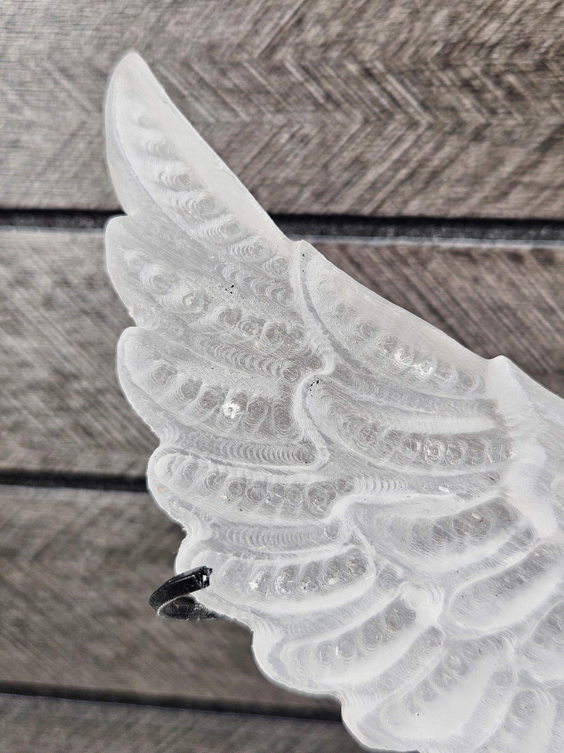 Deze indrukwekkende Seleniet Engel met uitgespreide vleugels is een ware blikvanger in iedere ruimte. Met een breedte van 18 cm en een hoogte van 16 cm straalt dit beeld rust, zuiverheid en bescherming uit. De vleugels staan op een zwarte standaard, waardoor de engel een elegante en zwevende uitstraling krijgt.