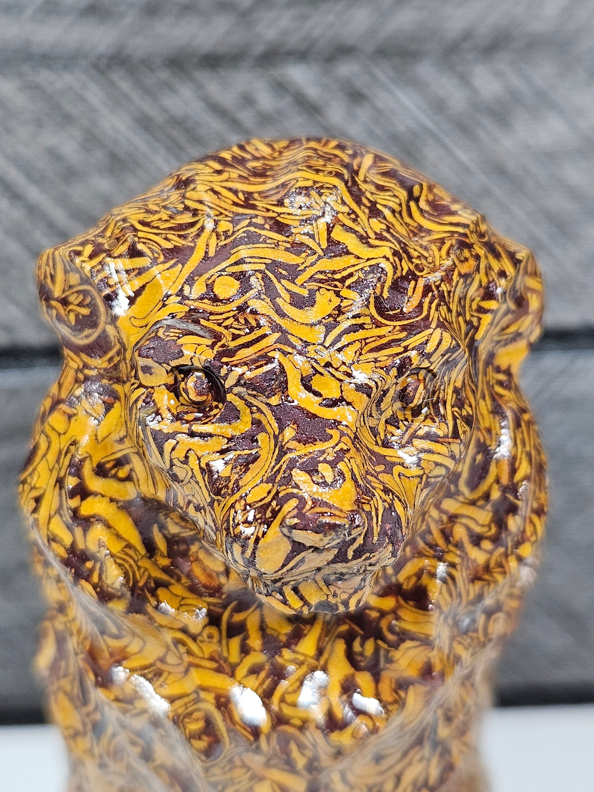 Slangen jaspis wordt vaak geassocieerd met bescherming, vernieuwing en innerlijke kracht. In combinatie met de symboliek van de leeuw, moed, leiderschap en zelfvertrouwen, ontstaat een betekenisvol krachtobject dat zowel spiritueel als decoratief waardevol is. Dit maakt de sculptuur geschikt als verzamelstuk, interieuraccent of persoonlijk symbool van kracht.
