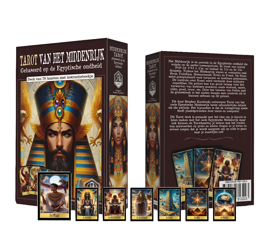 Het Middenrijk is de periode in de Egyptische oudheid die volgde op de eerste tussenperiode. Ze loopt van (circa) 2040 tot 1783 v. Chr. en beslaat de 11e en de 12e dynastie. Tijdens het Middenrijk waren er contacten met Syrië, Palestina, Mesopotamië, Kreta en Poent. De Sinaï werd geëxploiteerd voor turquoise en kostbare gesteenten. De controle over Koesj werd versterkt door militaire expedities. Dit gebied was van groot belang voor het verwerven van kostbare goederen zoals wierook, mirre, oliën, goud, ivoor, etc. Door het bouwen van forten met de grensstreek in het zuiden hoopte men controle uit te kunnen oefenen op dit gebied. Dit door Stephen Kandinski ontworpen Tarot van het oude Egyptische Middenrijk bevat uitzonderlijke details uit die periode. Het bijzondere is dat de vormgeving mede heeft plaatsgevonden door mens en computer. Dit Tarot deck is gemaakt met het idee om je kennis te laten maken met het oude Egyptische Middenrijk maar ook kunnen de Tarotkaarten je helpen met het vinden van antwoorden op grote en kleine vragen in je leven en ervoor zorgen dat je wordt aangezet om op zoek te gaan naar je innerlijke zelf.