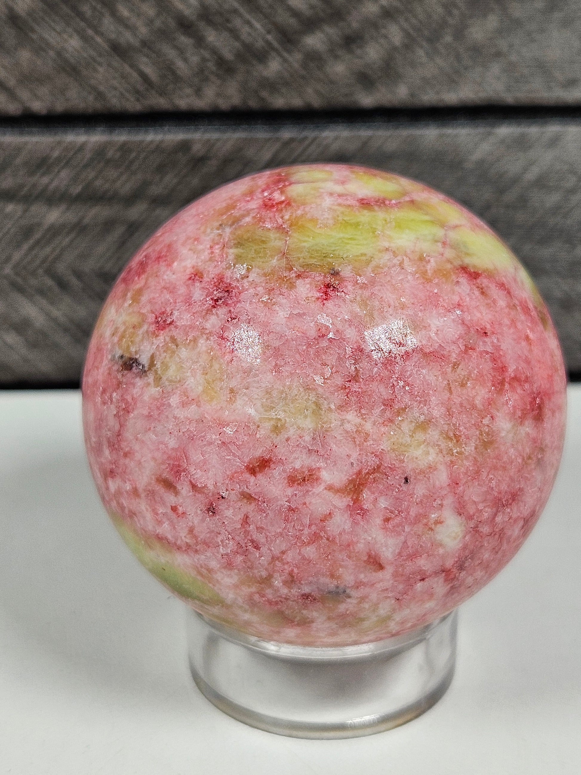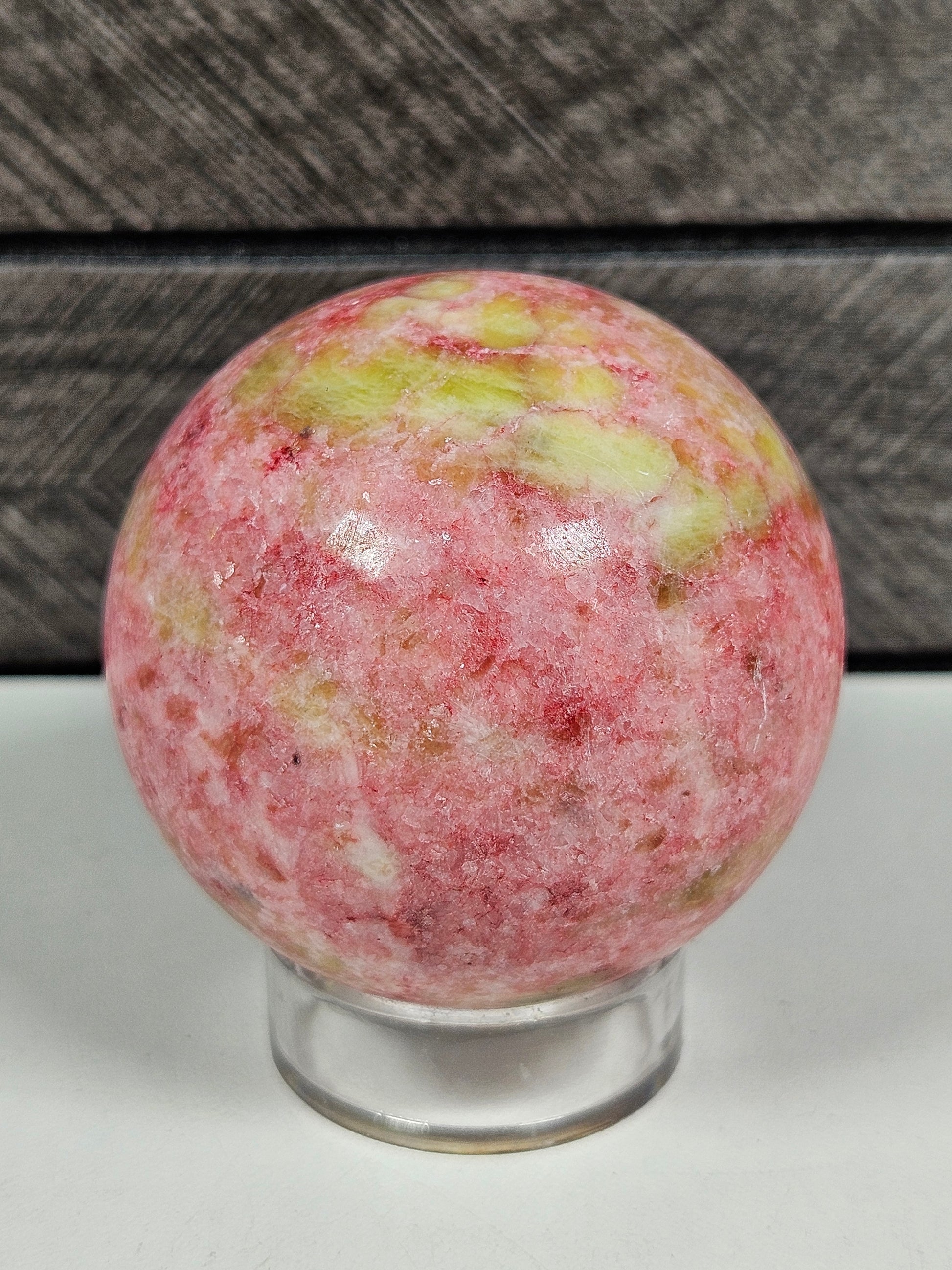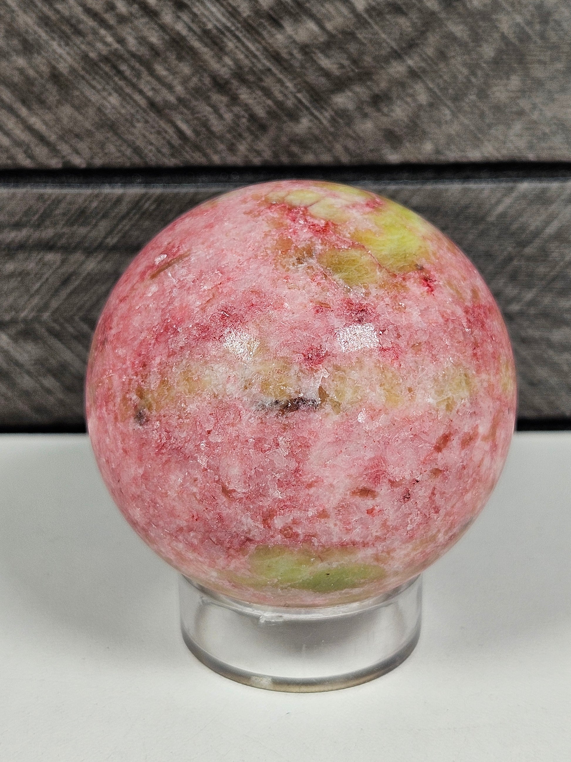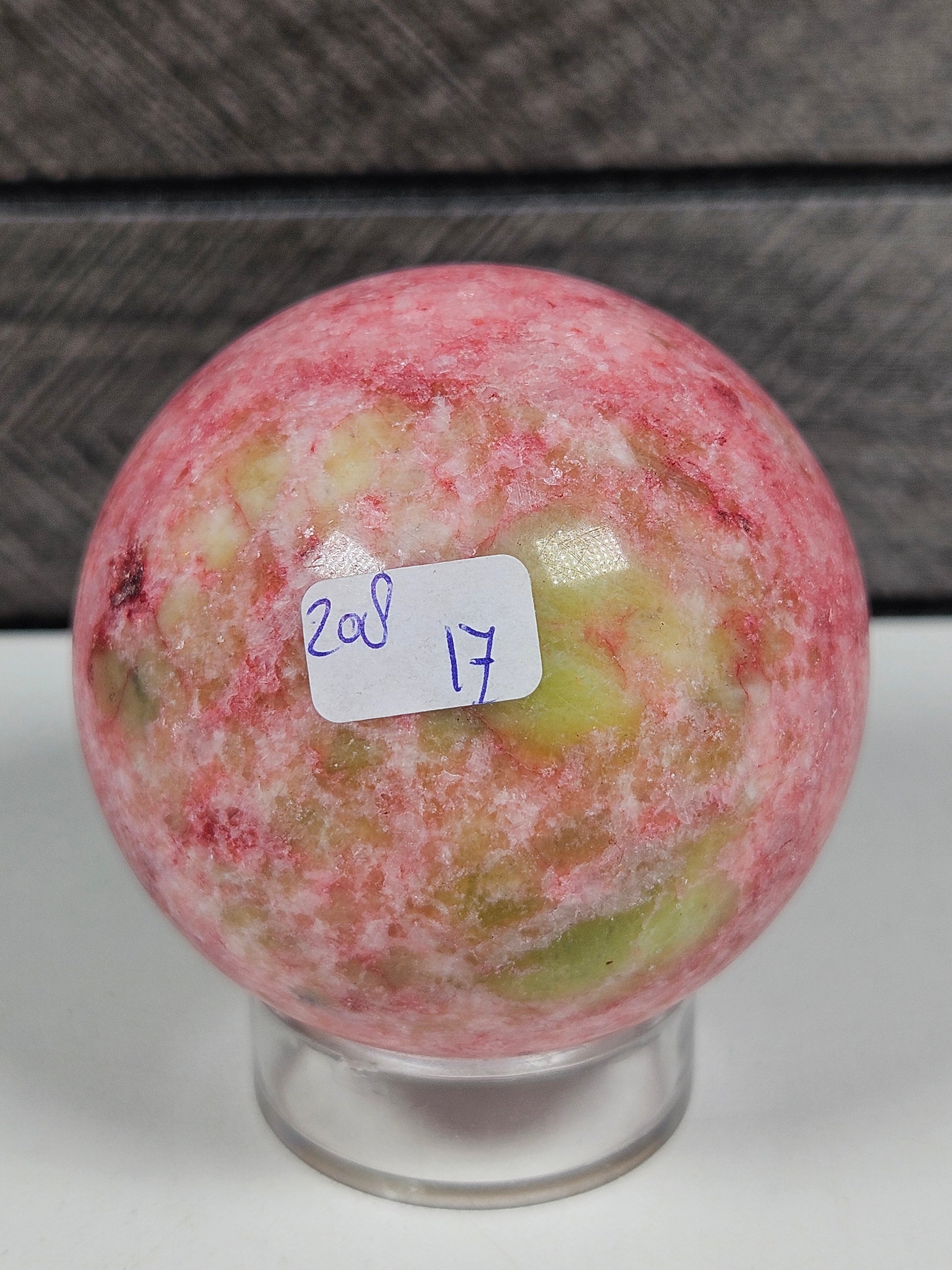 Deze thuliet bol is een uniek stuk natuursteen. Kleur, patronen en structuur zijn volledig natuurlijk gevormd, waardoor elke bol een eigen, unieke uitstraling heeft. Je ontvangt precies het exemplaar dat op de foto staat.