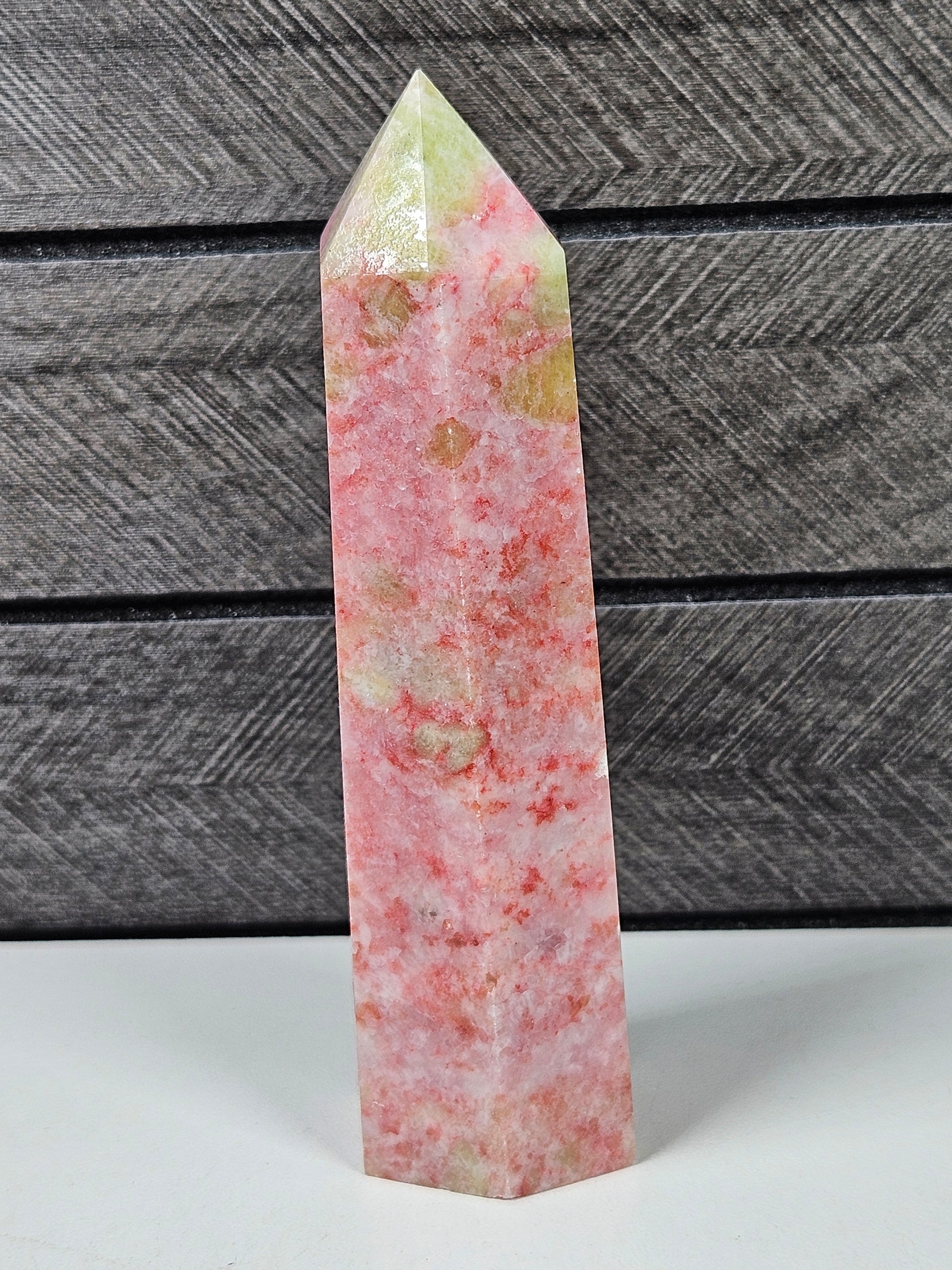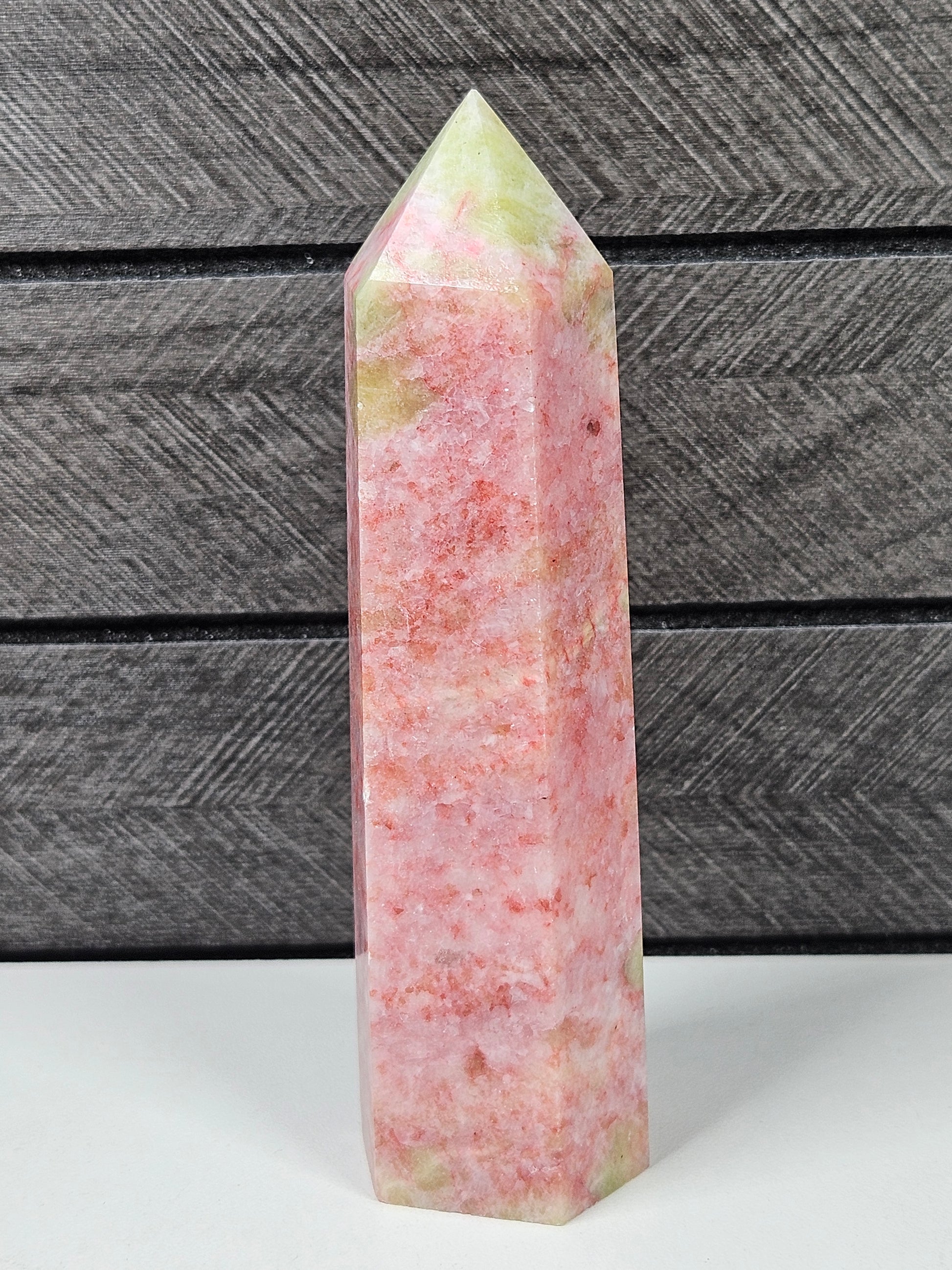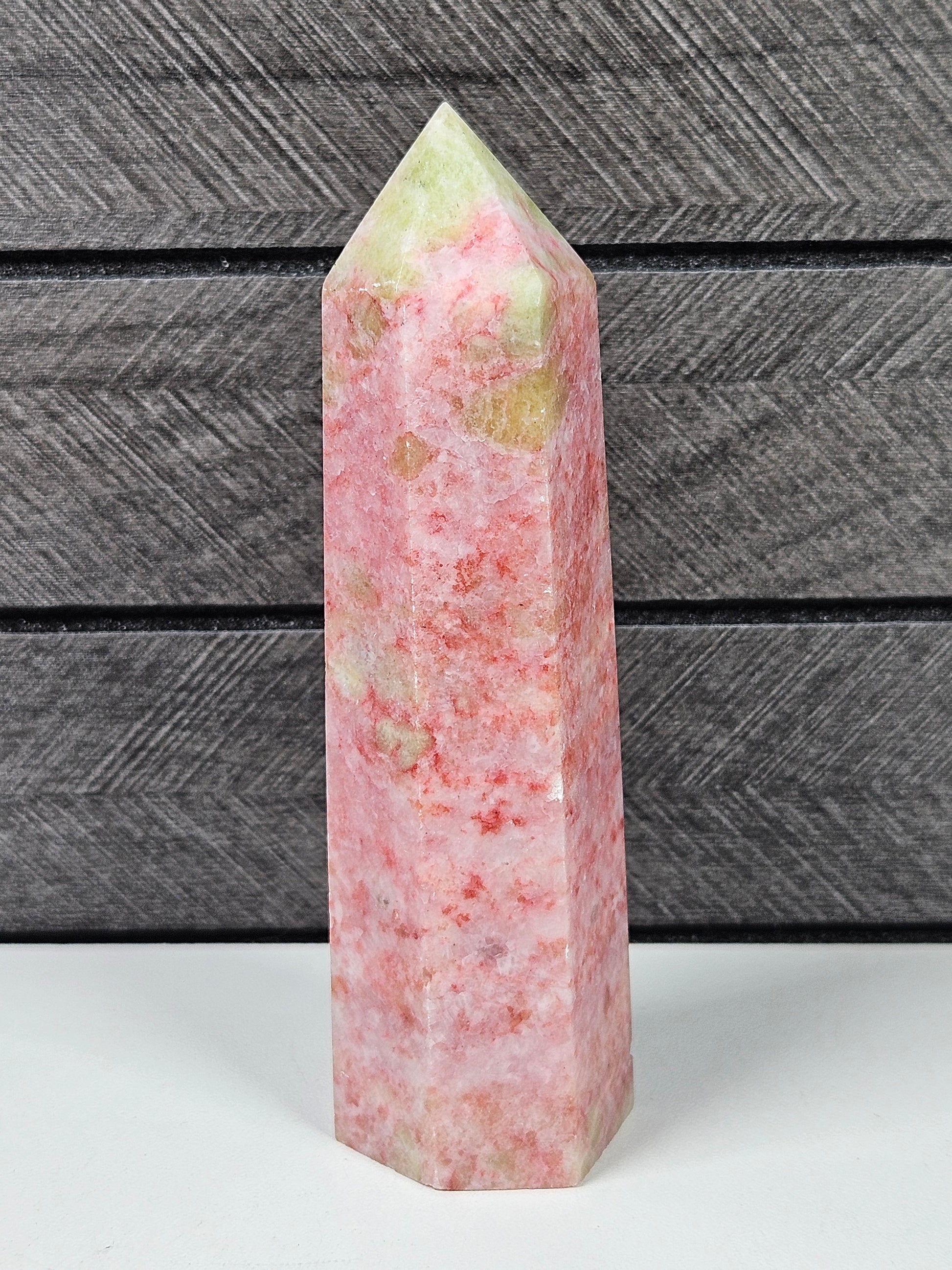 Deze Thuliet toren van 170 gram en circa 11,5 cm hoog is een krachtig en decoratief natuurproduct met een warme roze tot roodroze kleur. Thuliet is een zeldzame variëteit van zoïsiet en staat bekend om zijn energieke uitstraling en levendige kleur. De torenvorm geeft de steen een strakke en moderne presentatie en maakt hem geschikt voor uiteenlopende toepassingen.