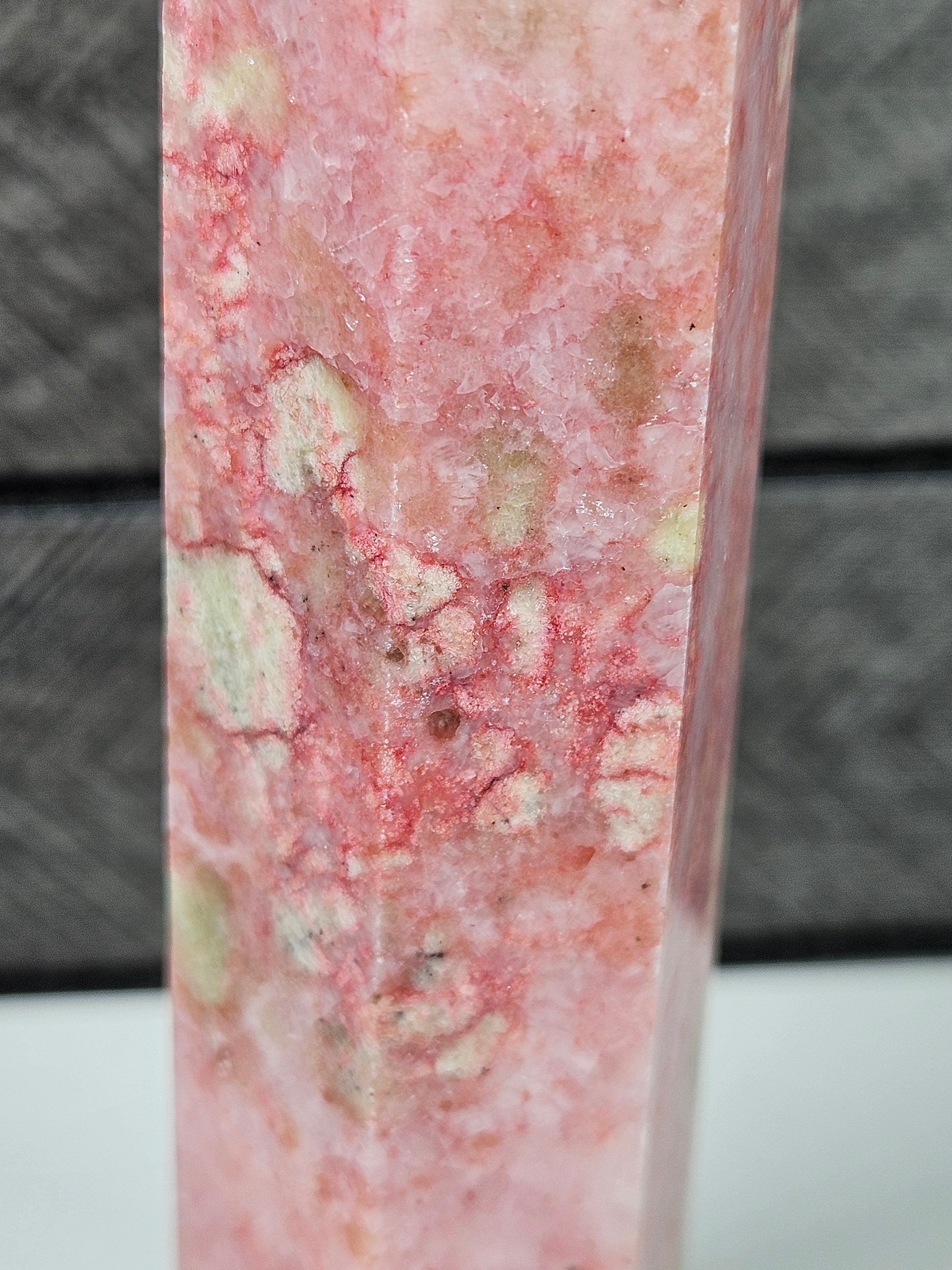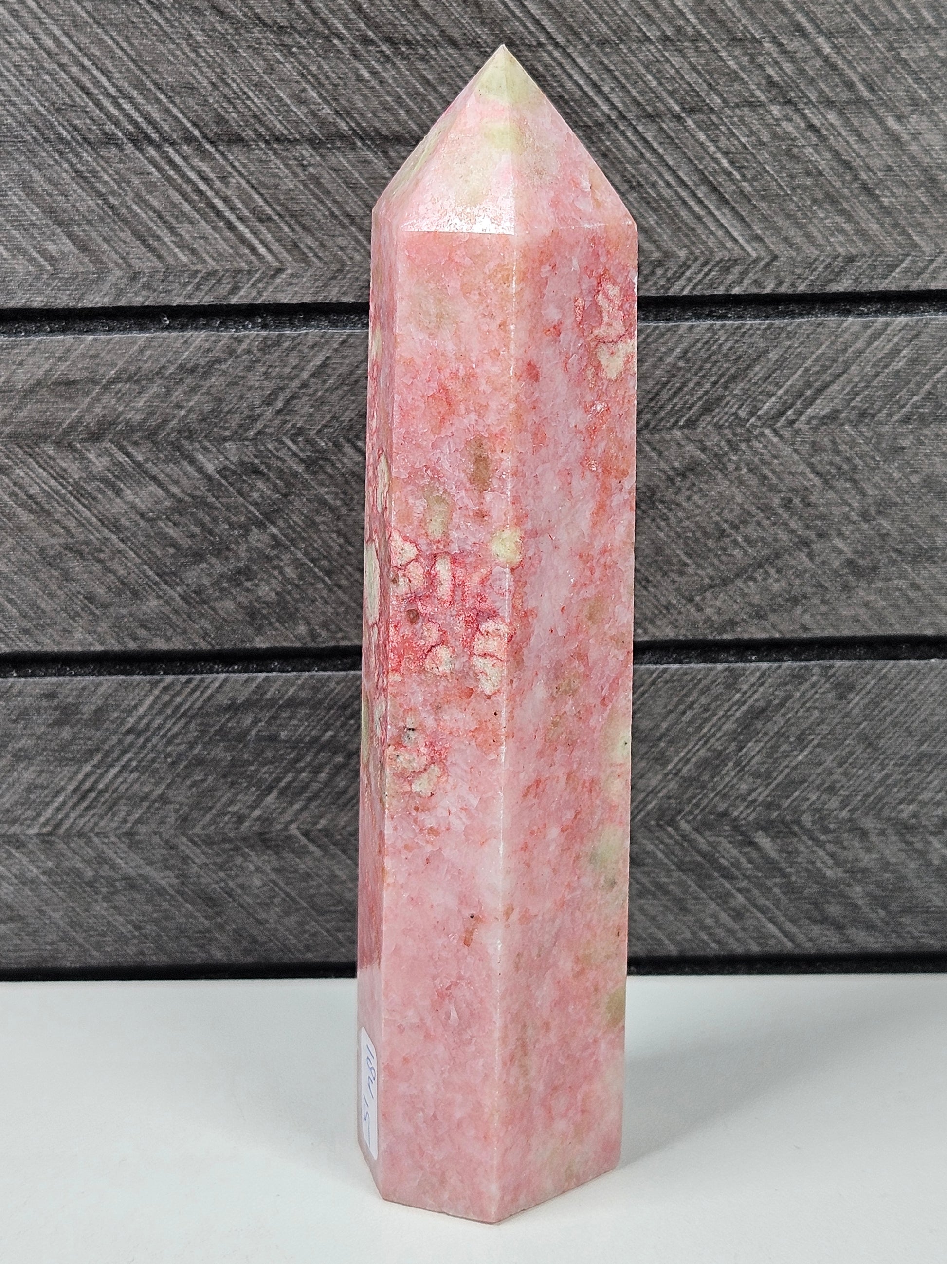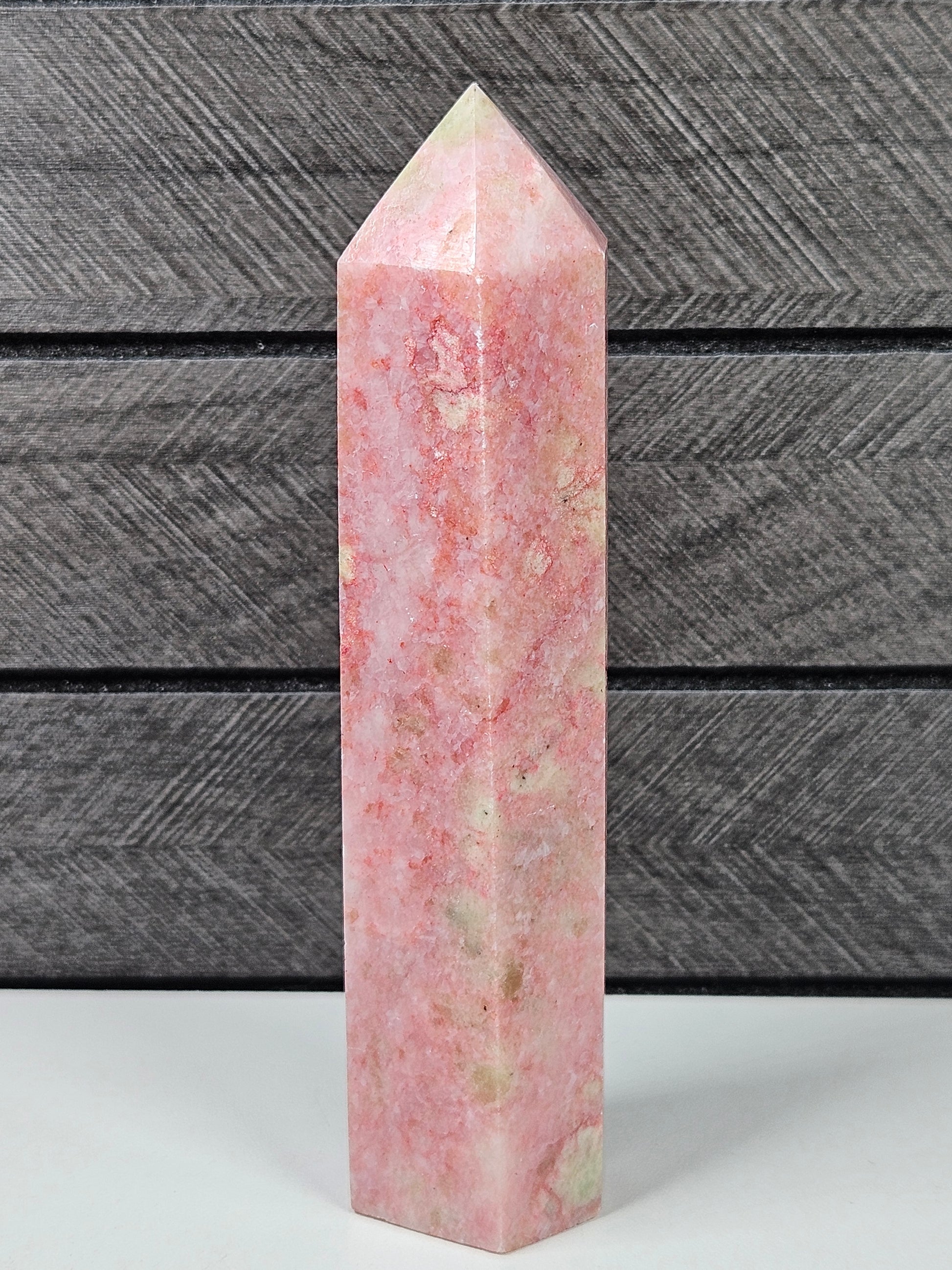 De gepolijste afwerking laat de natuurlijke kleur en structuur van de steen mooi tot hun recht komen. Dankzij het slanke formaat is deze toren eenvoudig te plaatsen op een bureau, plank, altaar of in een edelstenenverzameling.