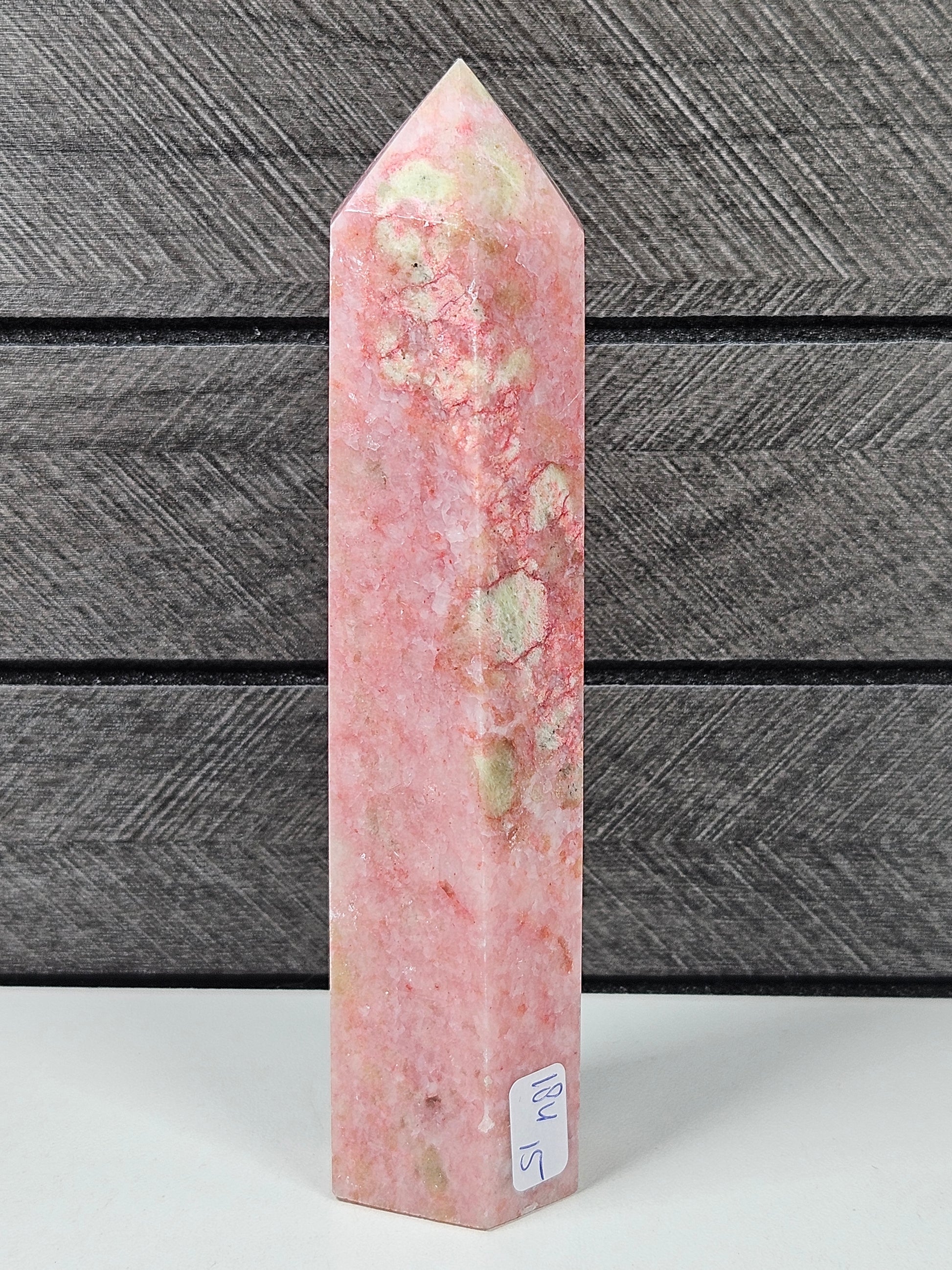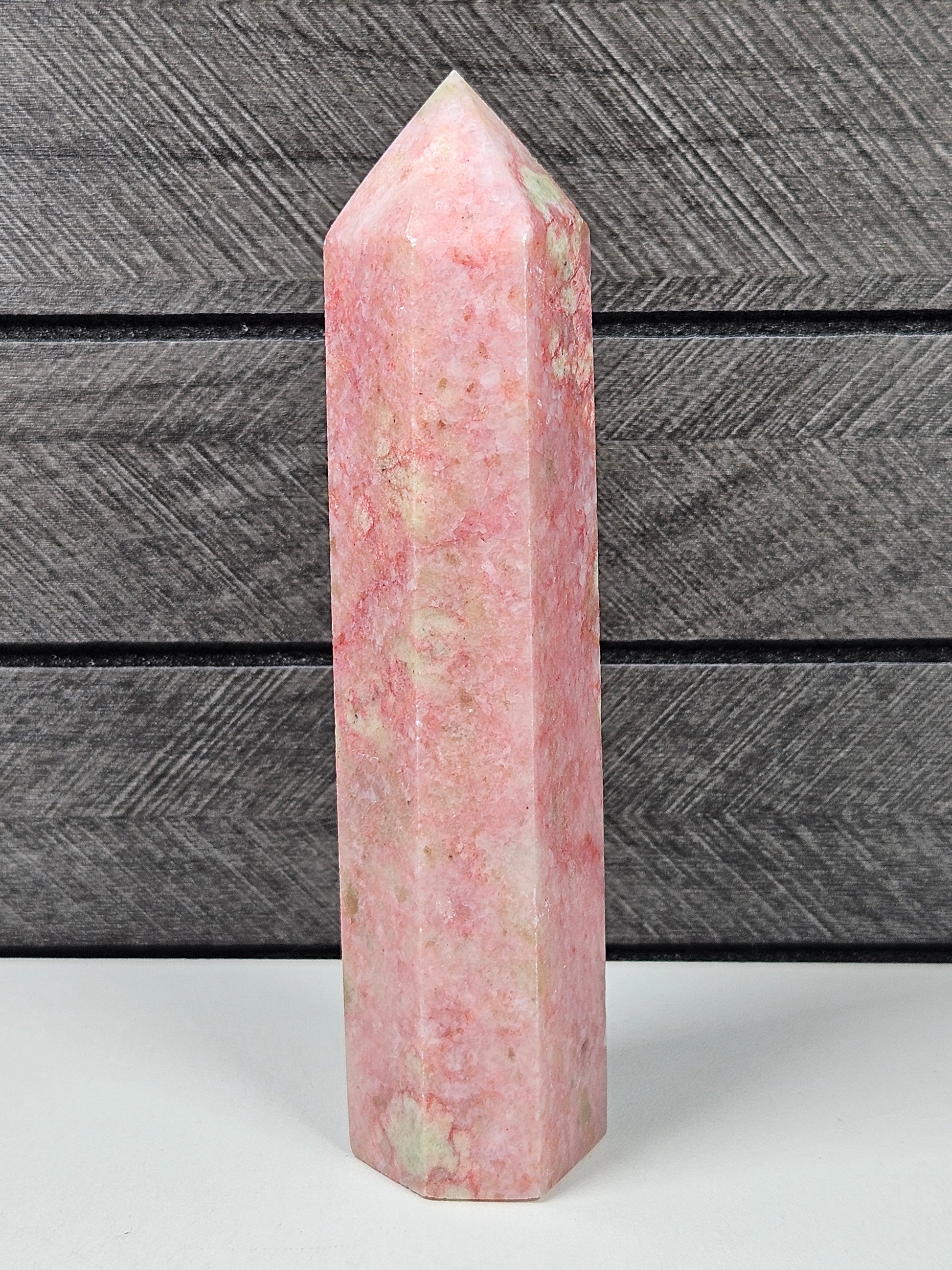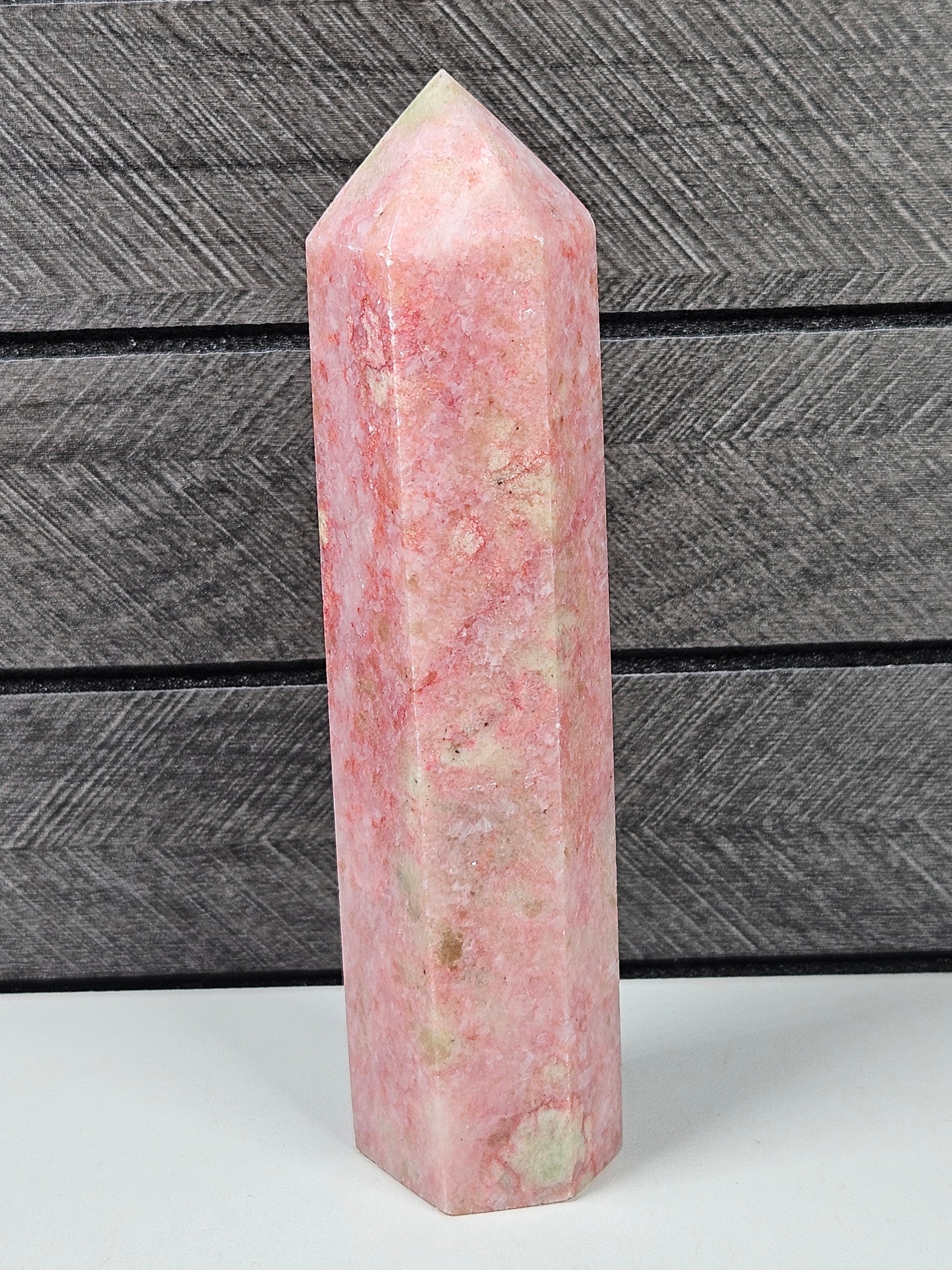 Deze Thuliet toren van 184 gram en circa 12,8 cm hoog is een elegant en krachtig natuurproduct met een warme roze tot roodroze kleur. Thuliet is een variëteit van zoïsiet en wordt gewaardeerd om zijn levendige uitstraling en energieke karakter. De torenvorm geeft de steen een strakke presentatie en maakt hem geschikt voor zowel decoratief als energetisch gebruik.