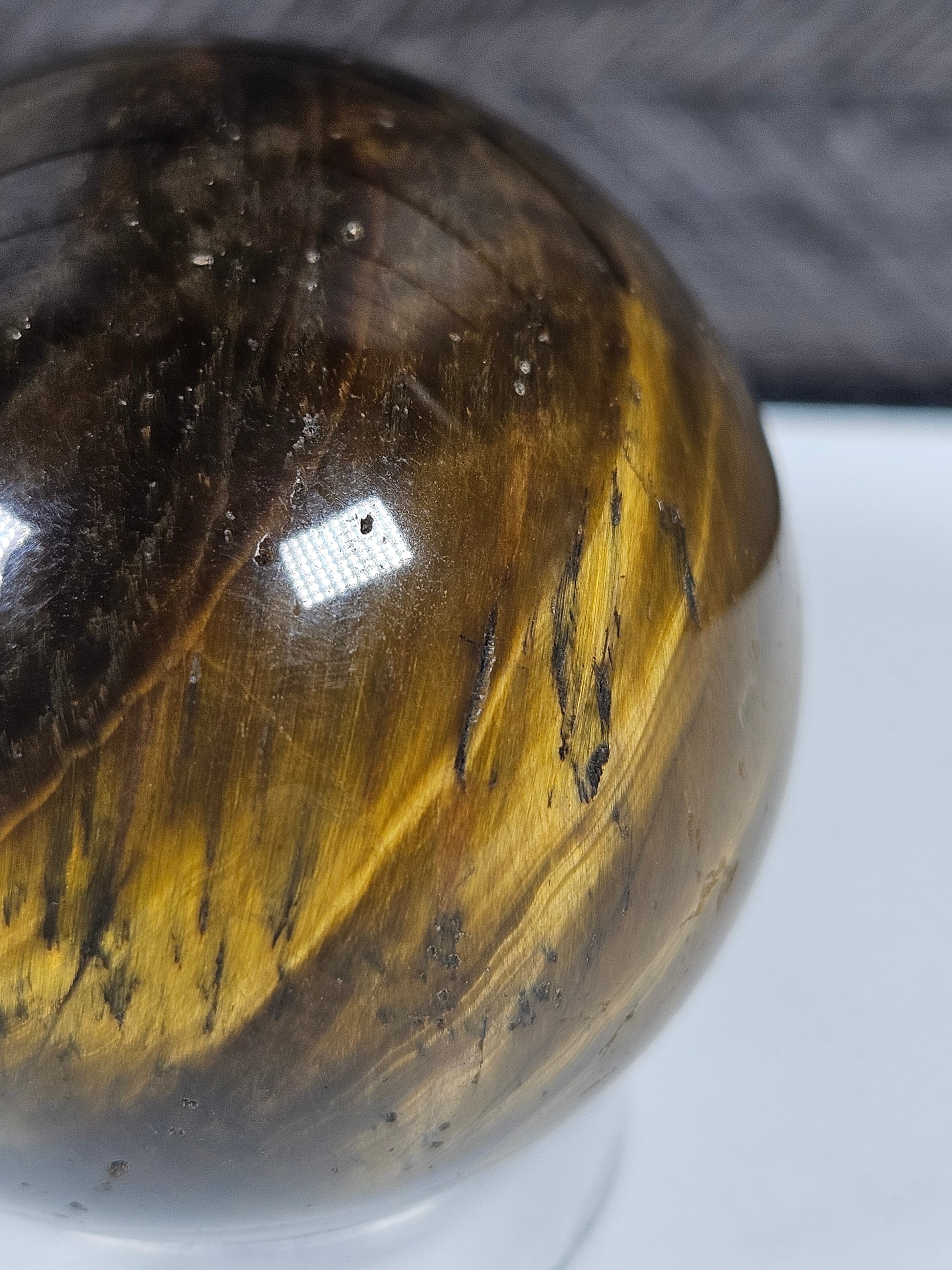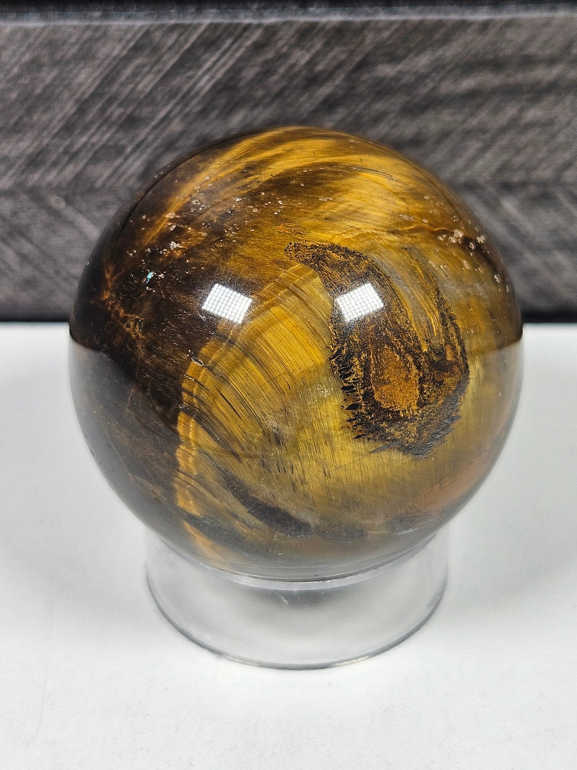 Deze warme en beschermende tijgeroog bol straalt kracht, focus en stabiliteit uit met zijn kenmerkende goudbruine tinten en zijdeachtige glans. Met een gewicht van 114 gram en een diameter van 4,3 cm is deze bol compact en ideaal voor gebruik op een altaar, bureau of in een edelstenenopstelling.