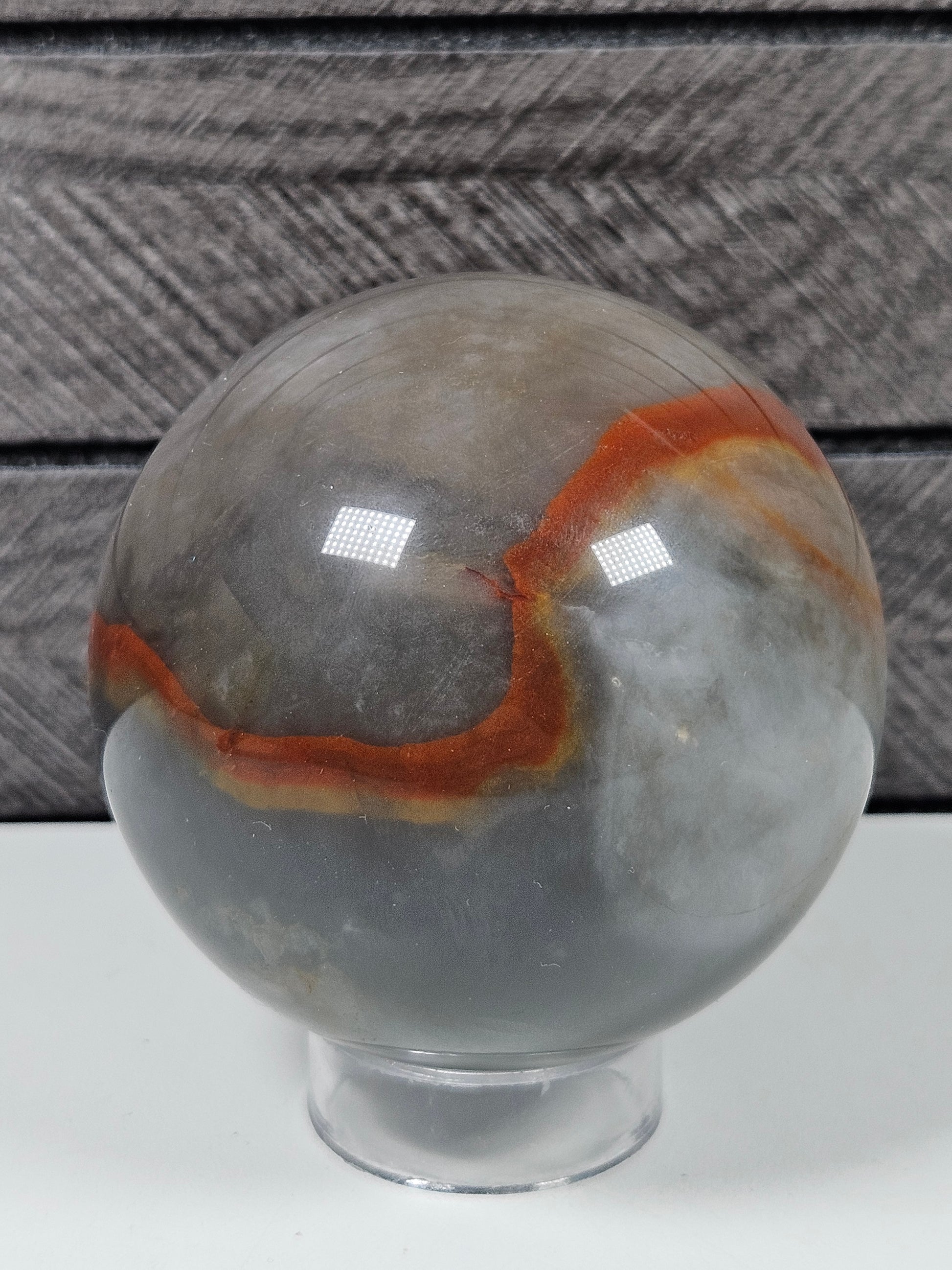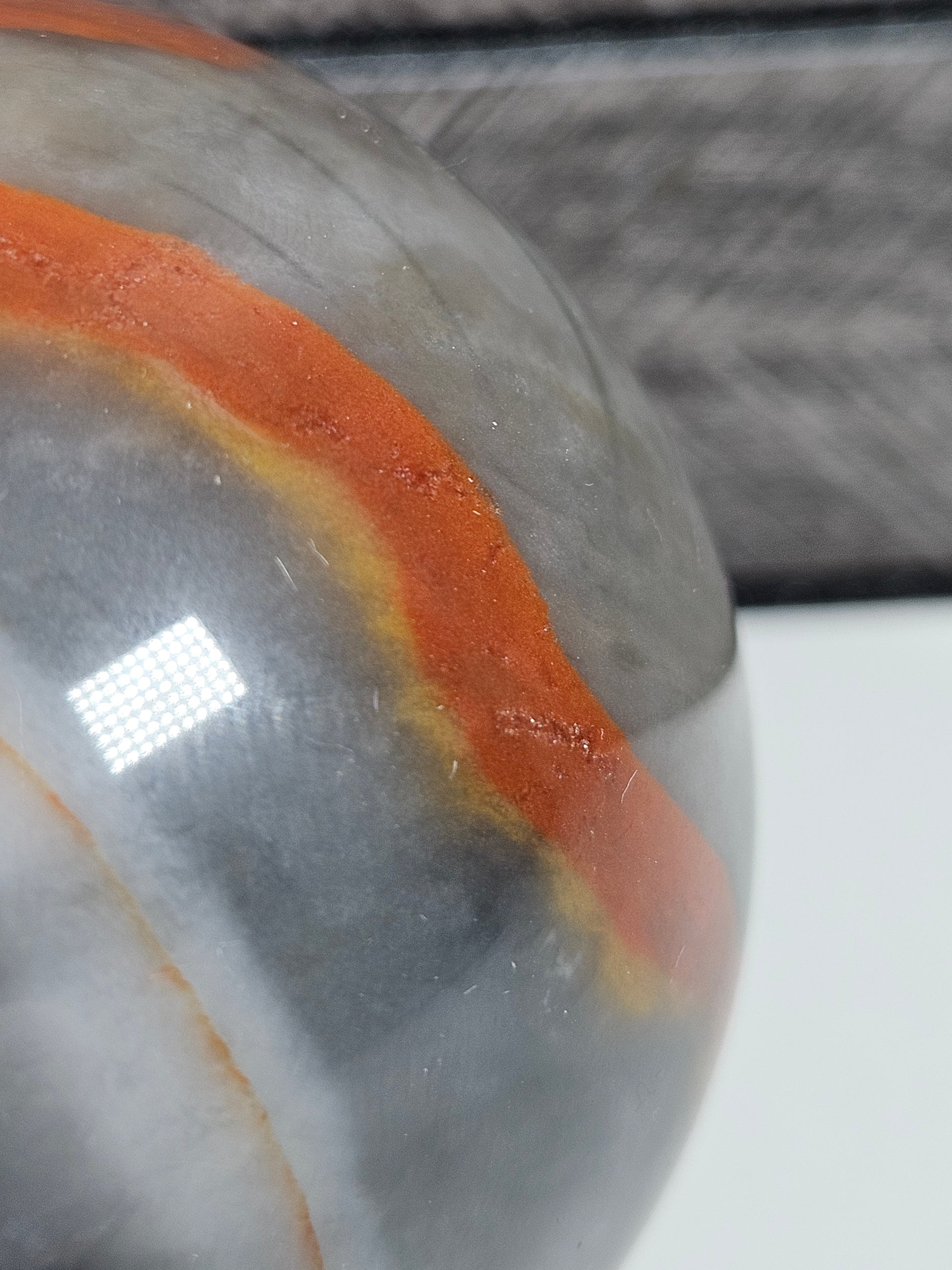 Deze vuuragaat bol is een uniek stuk natuursteen. Kleur, patronen en tekening zijn volledig natuurlijk gevormd, waardoor elke steen een eigen karakter heeft. Je ontvangt precies de bol die op de foto staat.