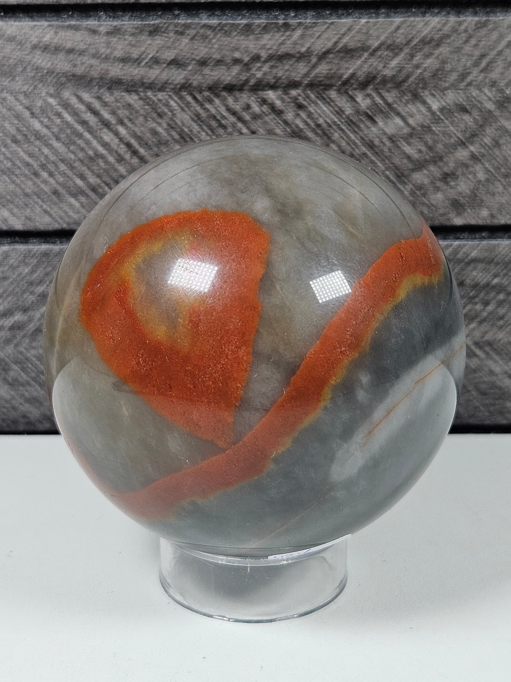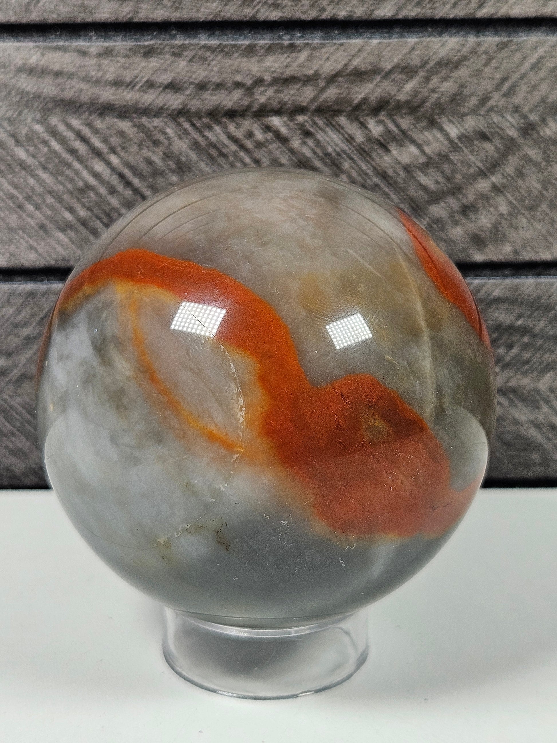 Deze prachtige vuuragaat bol heeft warme, aardse tinten met natuurlijke patronen die de steen een levendige en krachtige uitstraling geven. De gepolijste bolvorm laat de unieke tekening van de steen vanuit elke hoek mooi tot zijn recht komen, waardoor het een bijzondere decoratieve edelsteen is voor in huis of in een spirituele ruimte.