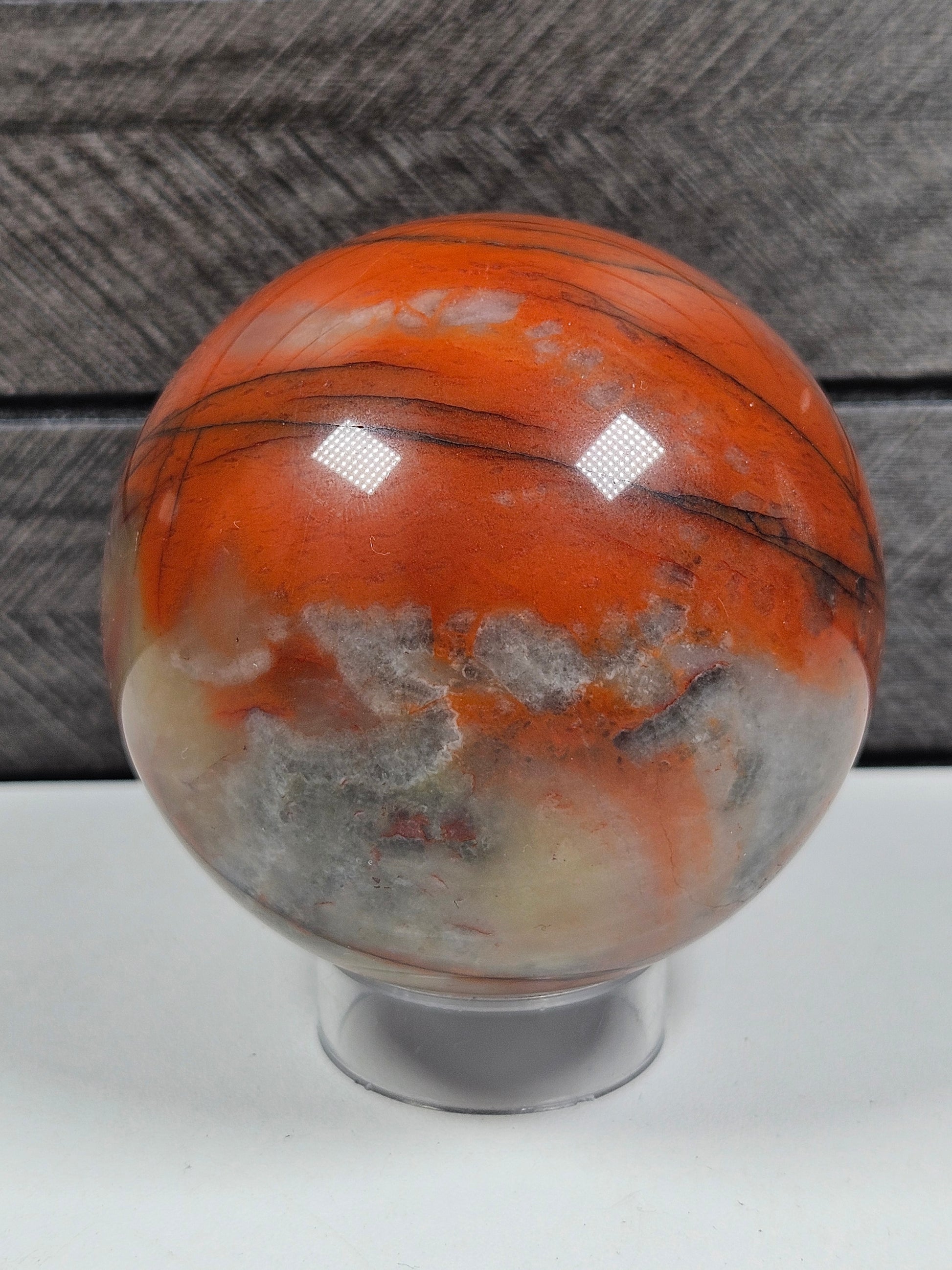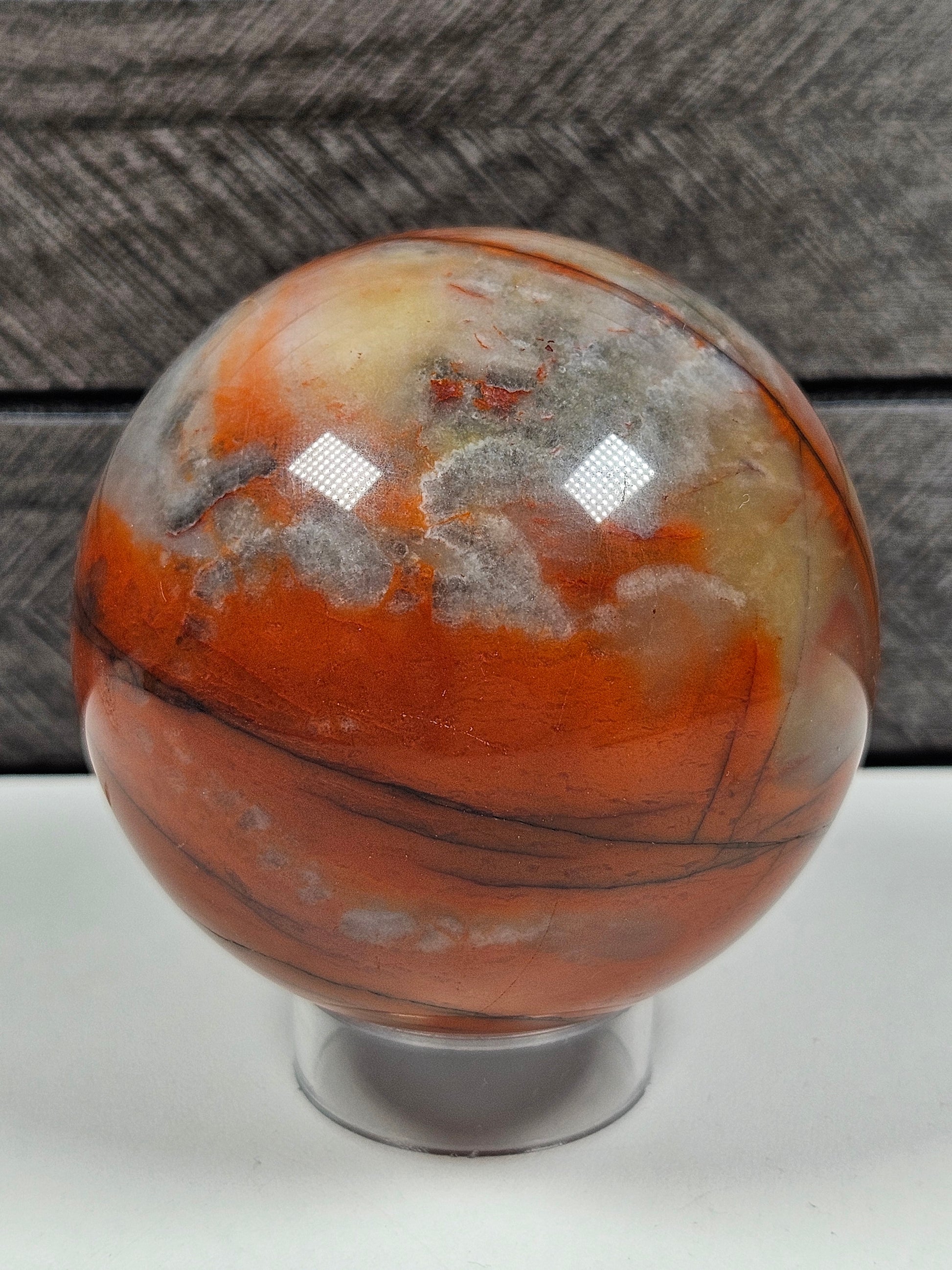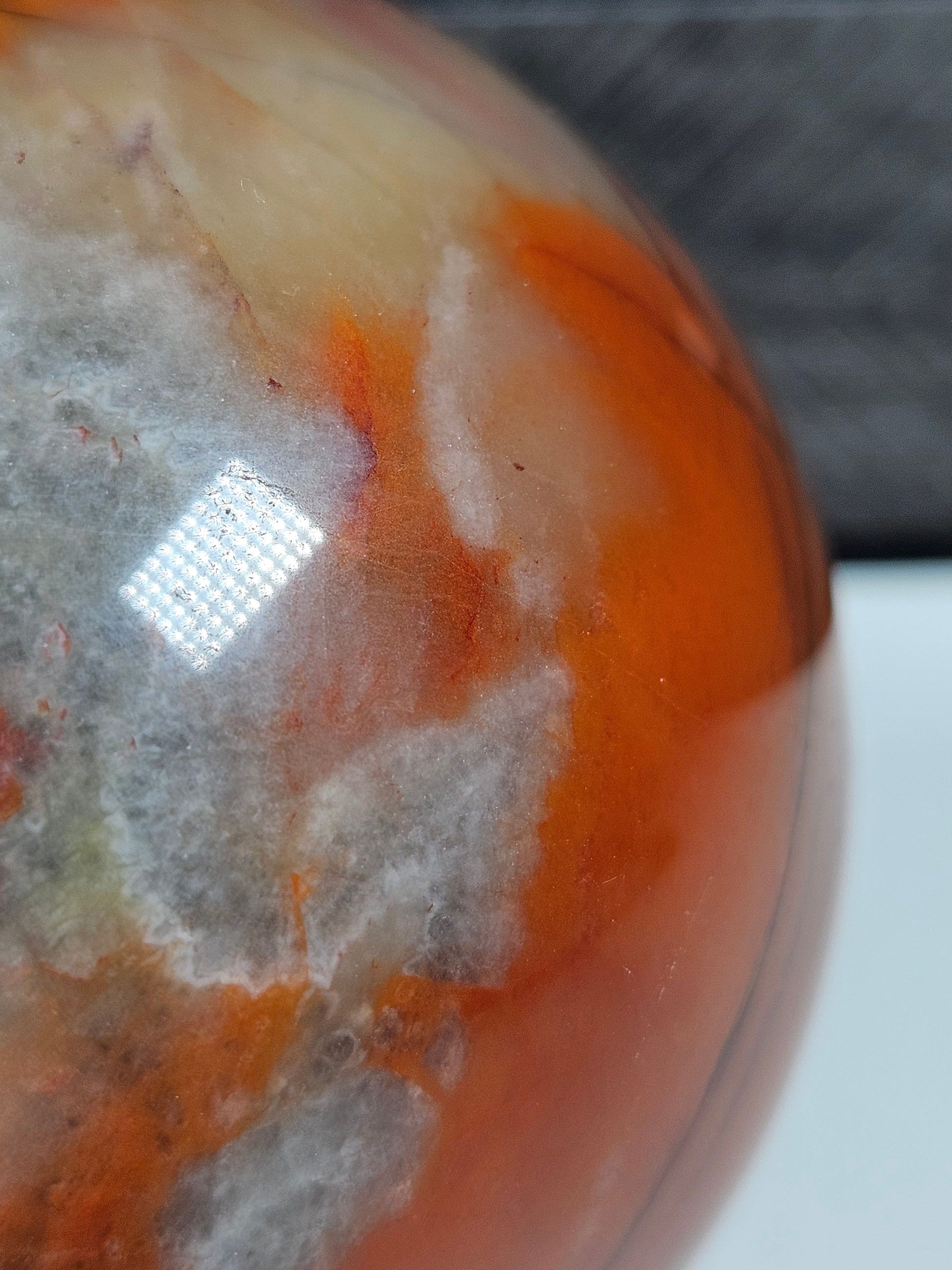 Deze Vuuragaat bol van 422 gram met een diameter van circa 6,7 cm is een indrukwekkende edelstenen bol met warme aardse kleuren en bijzondere natuurlijke patronen. De steen toont een mooie combinatie van roodbruine, oranje en grijze tinten die samen zorgen voor een levendige en krachtige uitstraling.