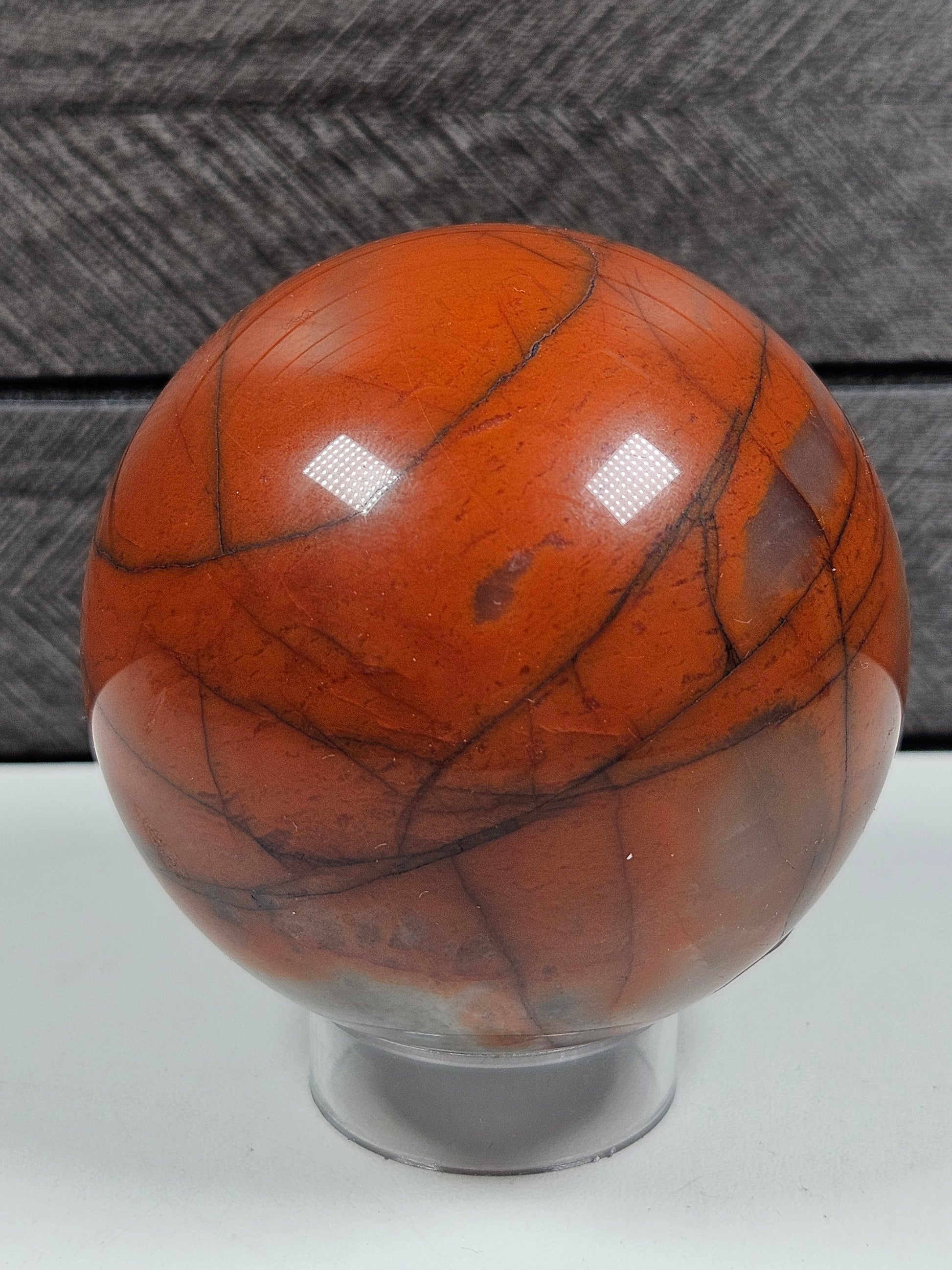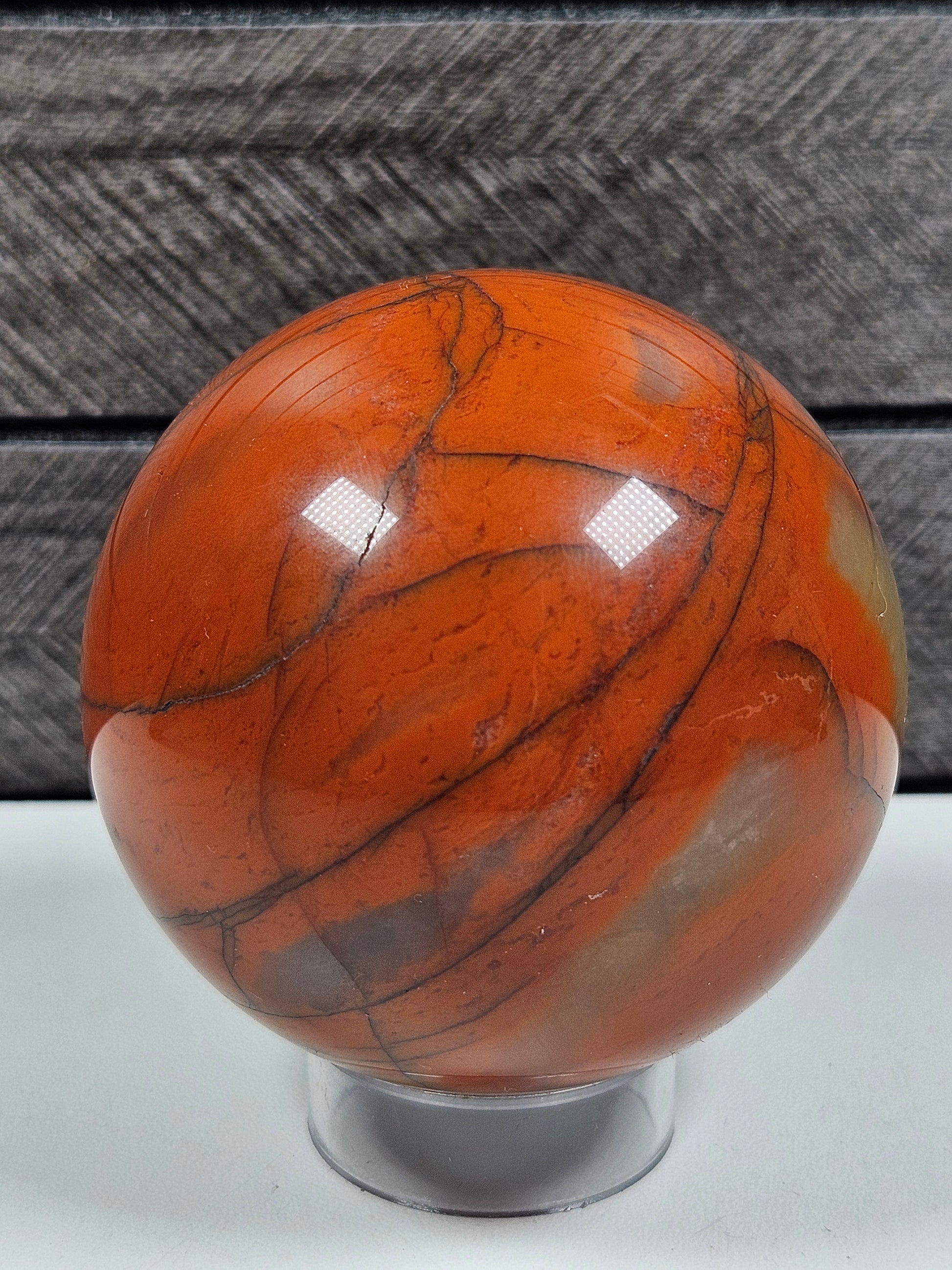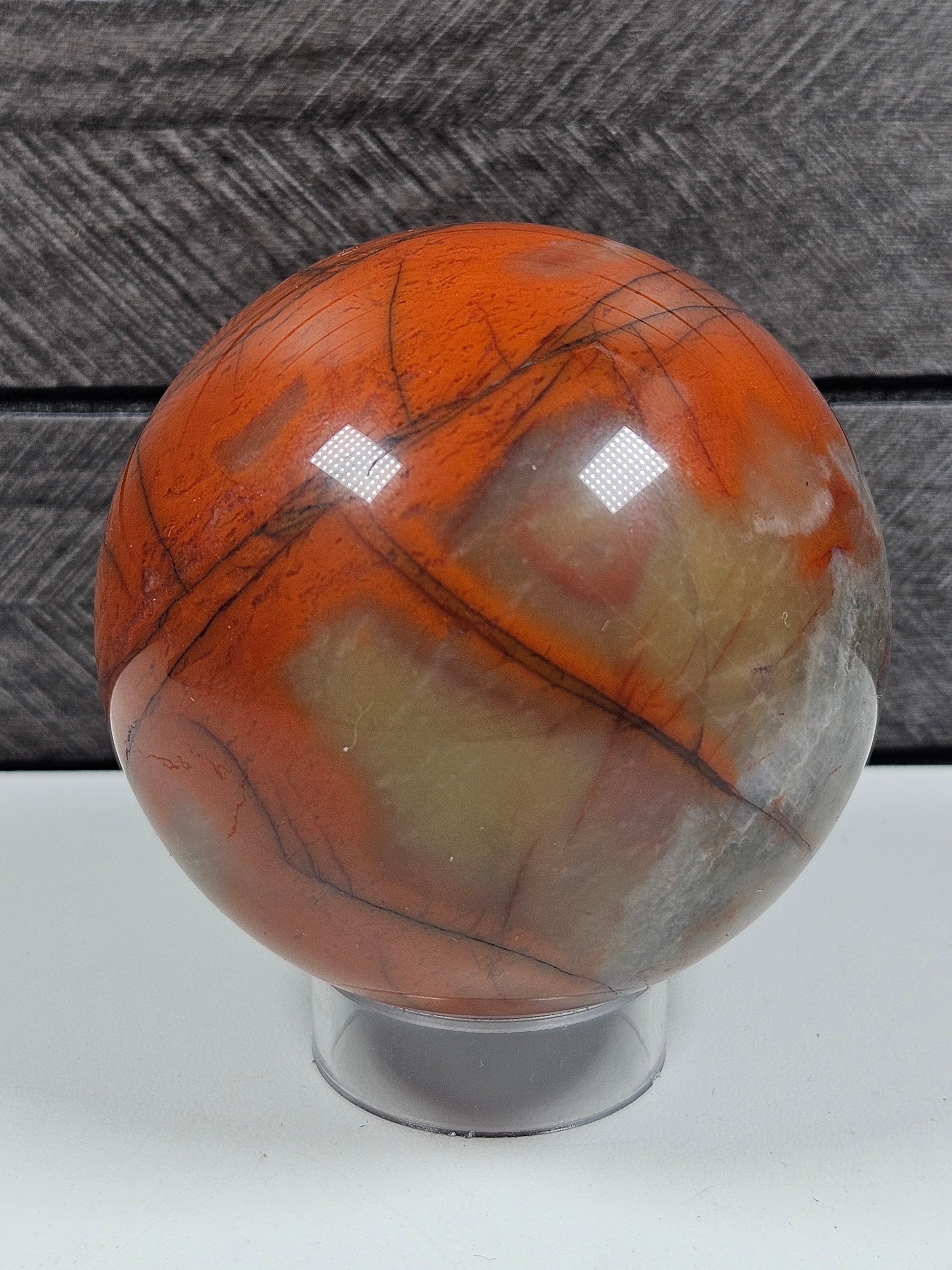 Deze Vuuragaat bol van 422 gram met een diameter van circa 6,7 cm is een indrukwekkende edelstenen bol met warme aardse kleuren en bijzondere natuurlijke patronen. De steen toont een mooie combinatie van roodbruine, oranje en grijze tinten die samen zorgen voor een levendige en krachtige uitstraling.