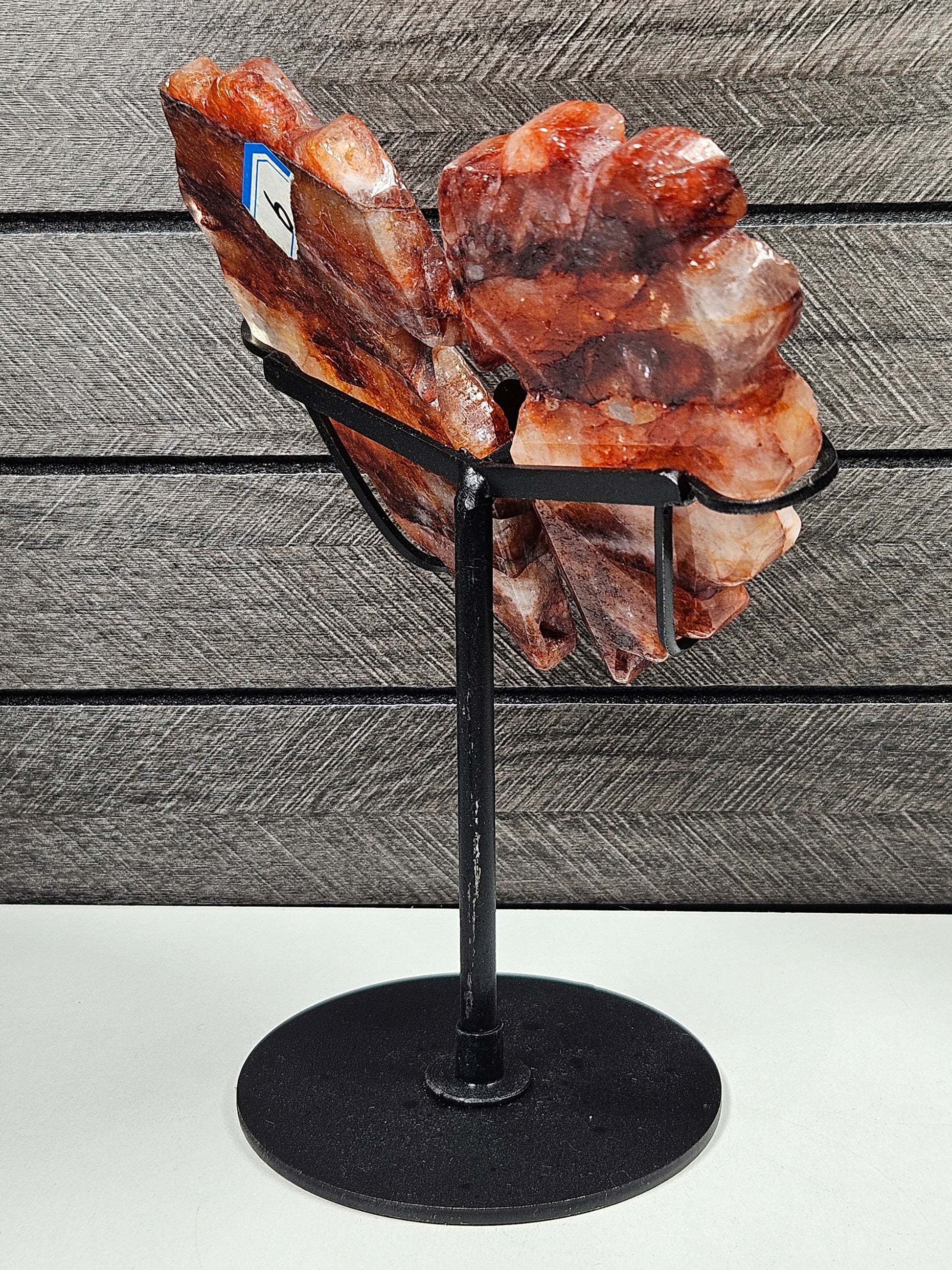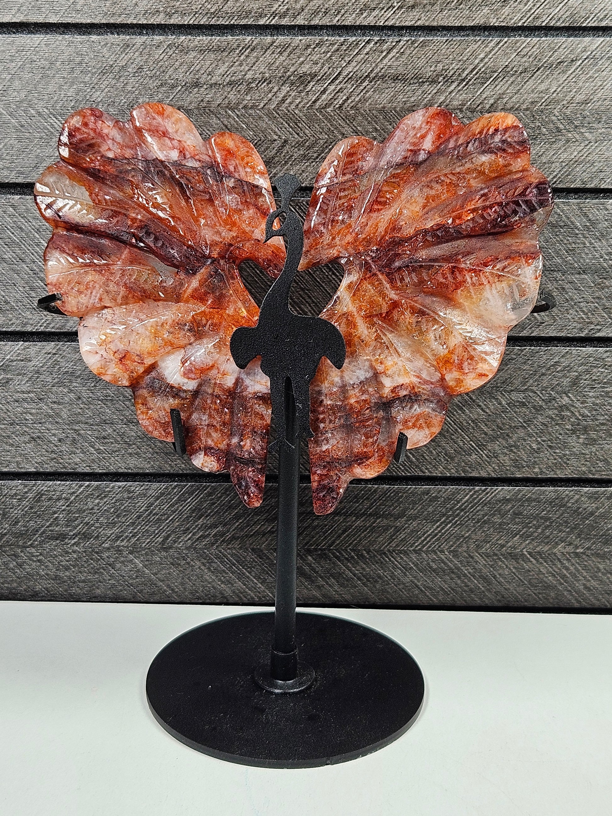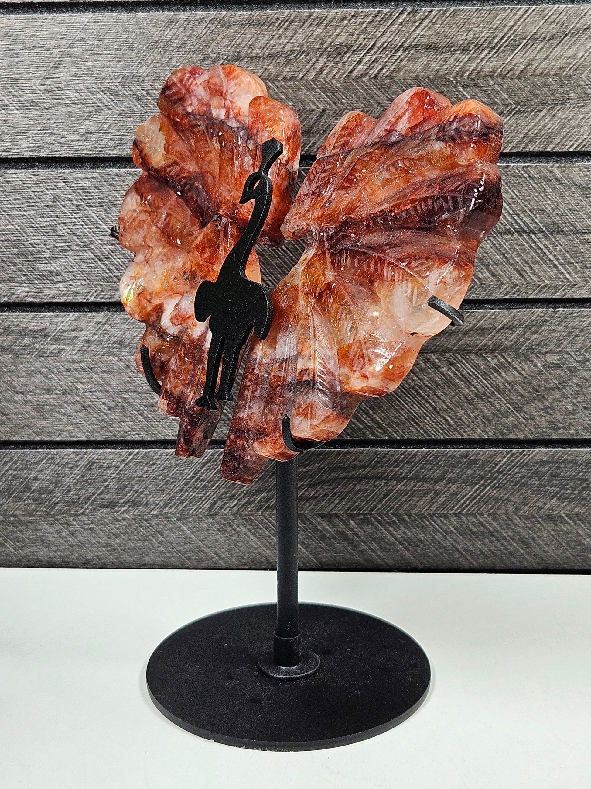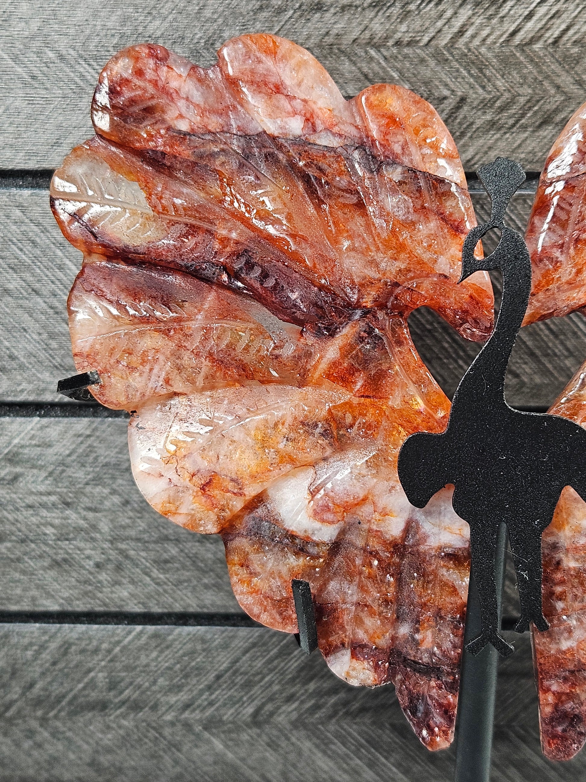 Laat je betoveren door de vurige energie en schoonheid van deze Vuurkwarts pauw vleugels op standaard (nr6). Met een afmeting van 17 bij 14 cm is dit handgecarvde kunstwerk een unieke combinatie van natuurlijke kracht en verfijnde elegantie. De diepe tinten van vuurkwarts schitteren prachtig in het licht en symboliseren energie, passie en innerlijke kracht.