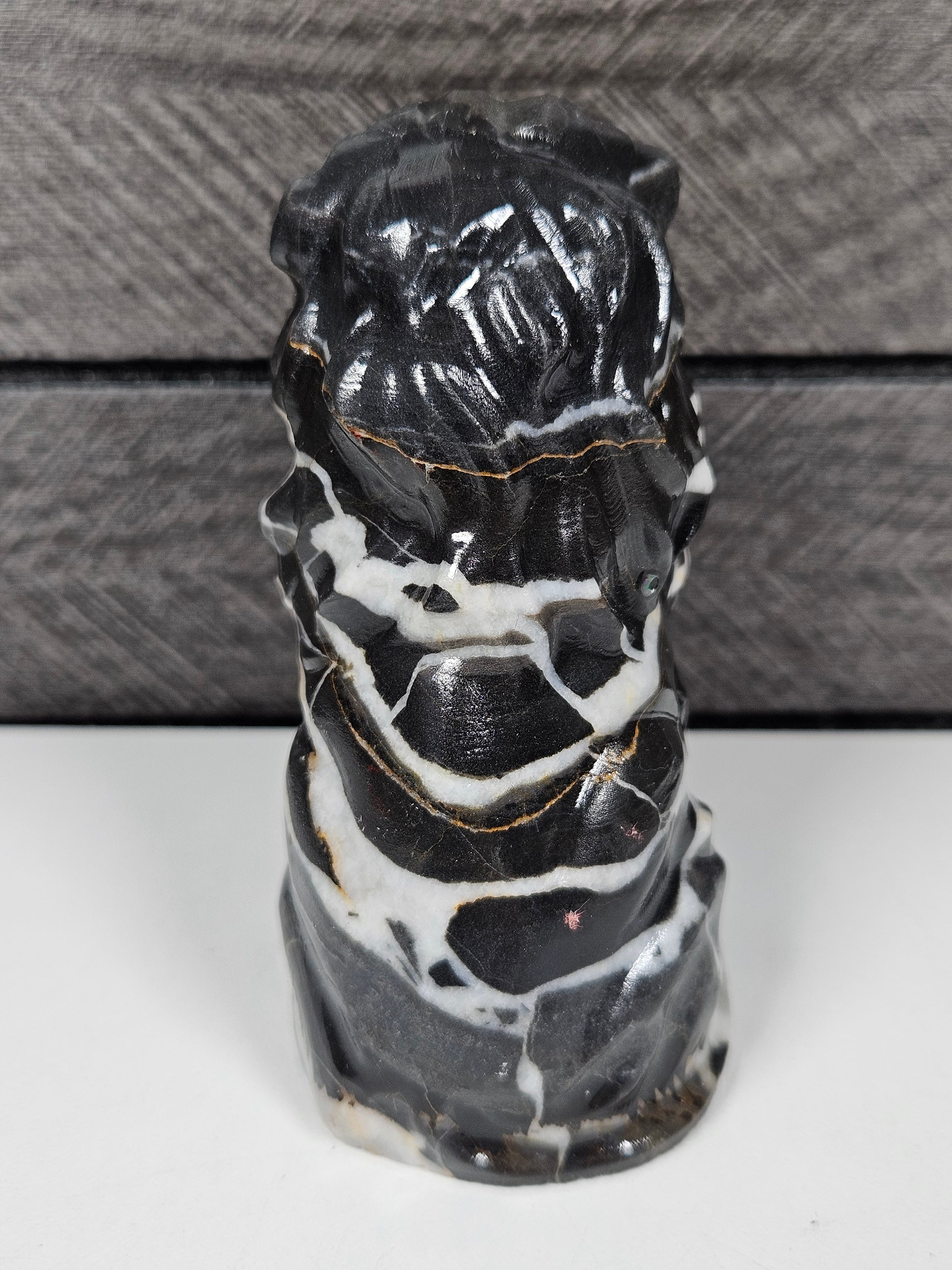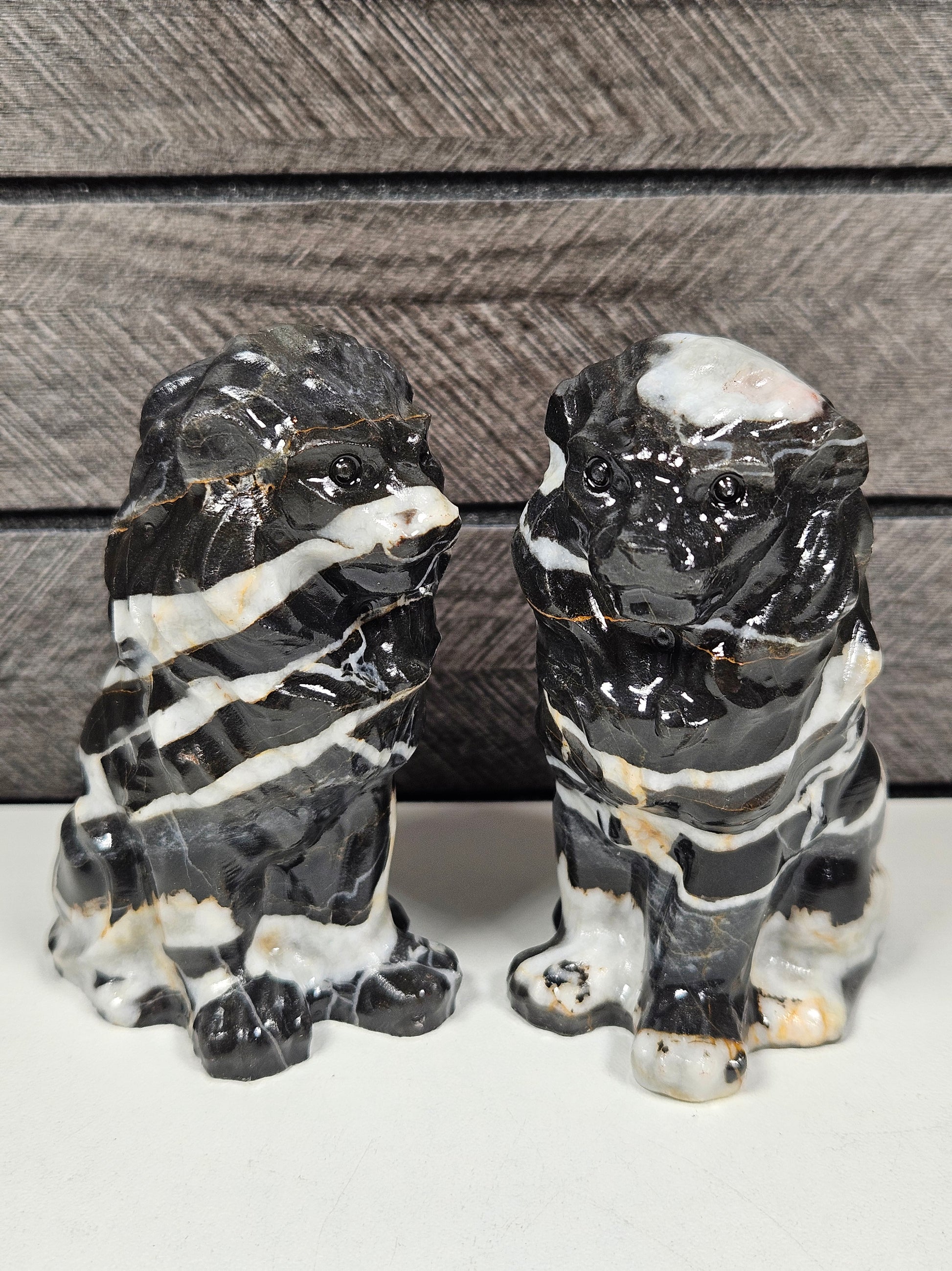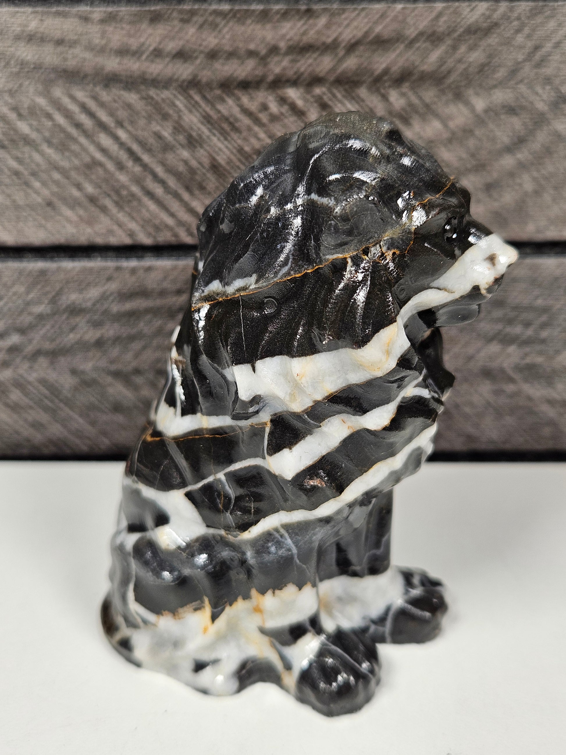 Deze Zebra Jaspis Leeuw van 222 gram en circa 8 cm hoog is een compact en krachtig edelsteen sculptuur met een opvallende zwart witte tekening. Zebra jaspis staat bekend om zijn karakteristieke strepen en contrastrijke patronen, waardoor elk beeld een unieke uitstraling heeft. De natuurlijke lijnen en kleurschakeringen geven de leeuw extra diepte en karakter.