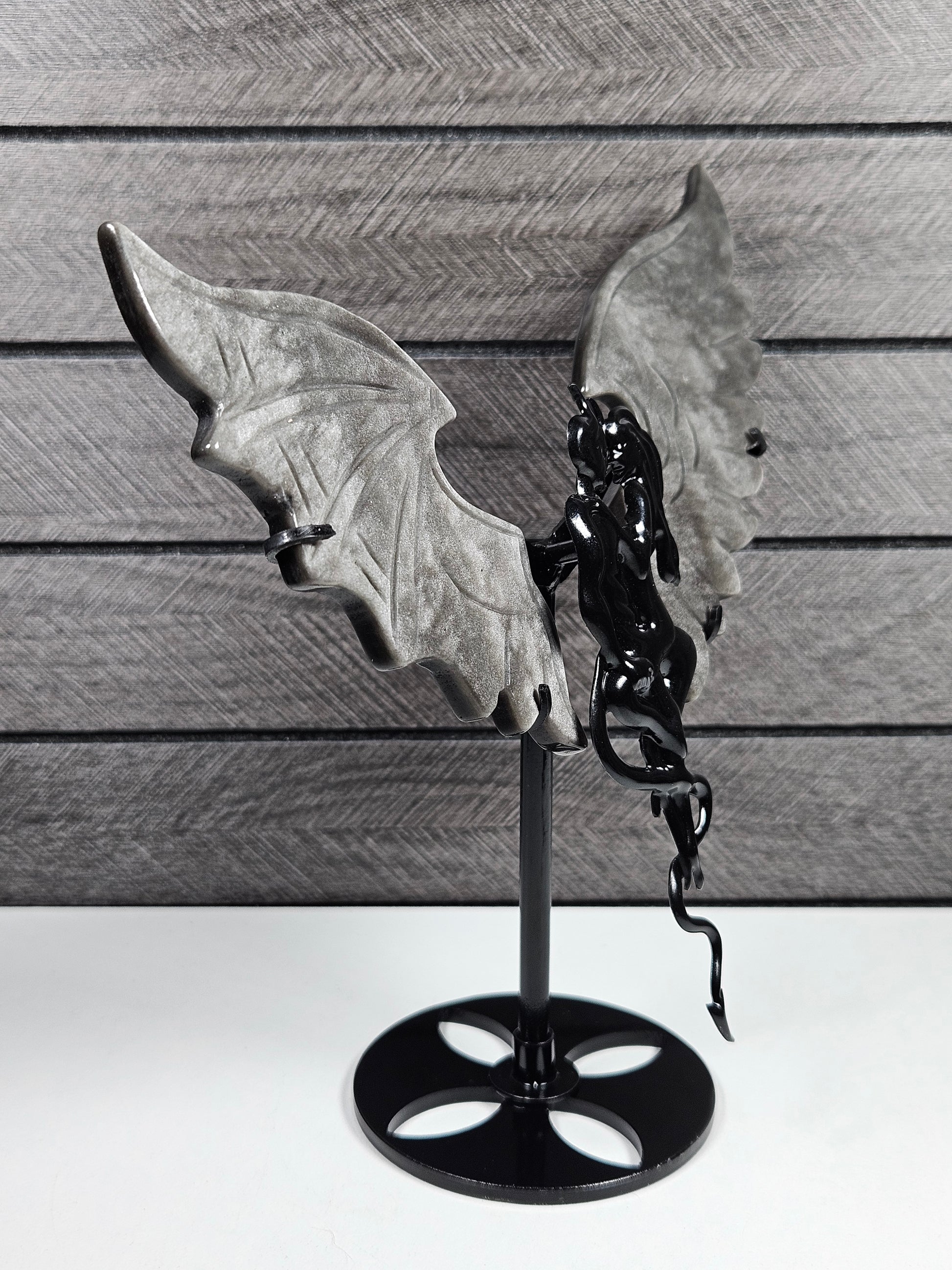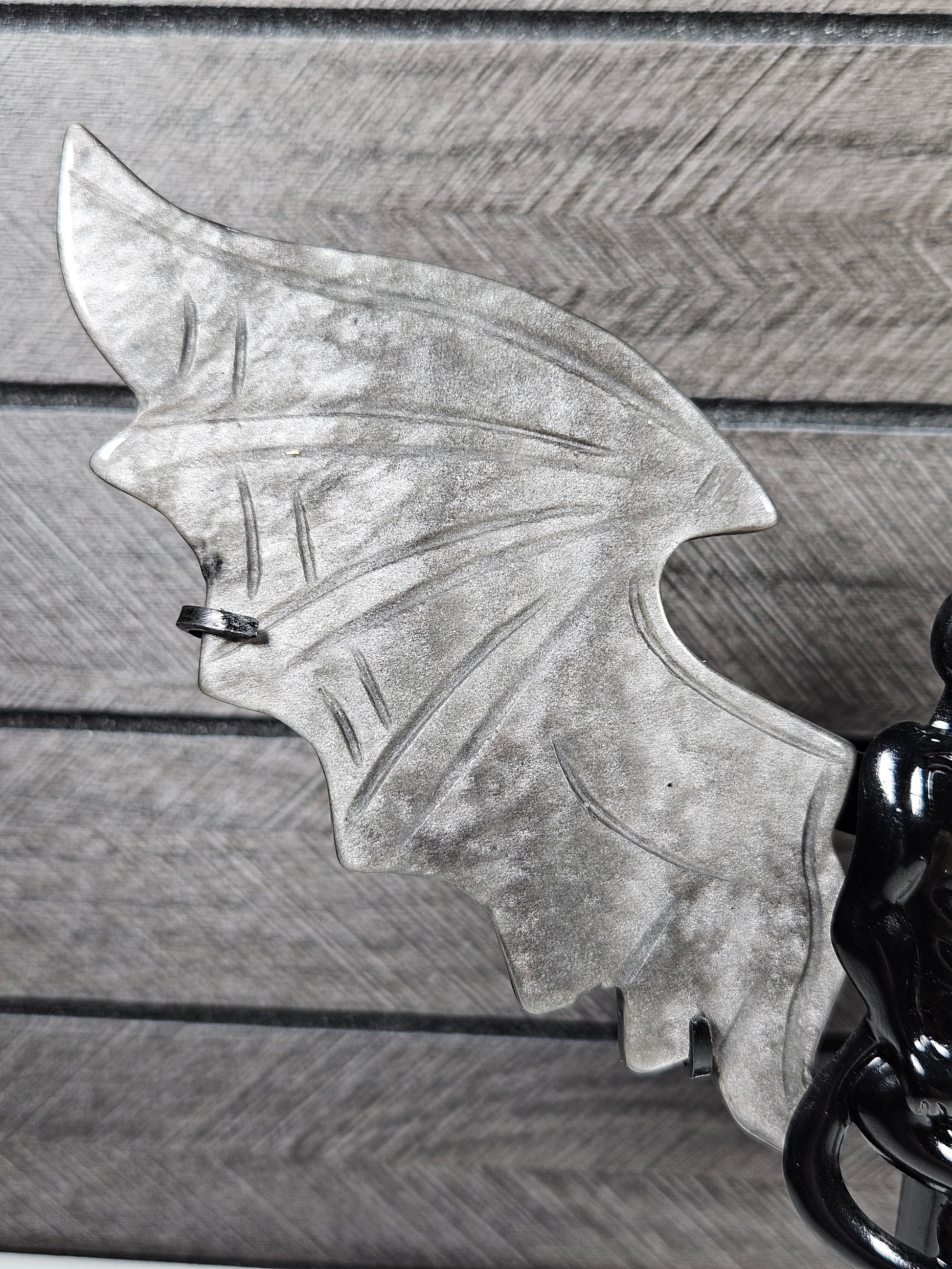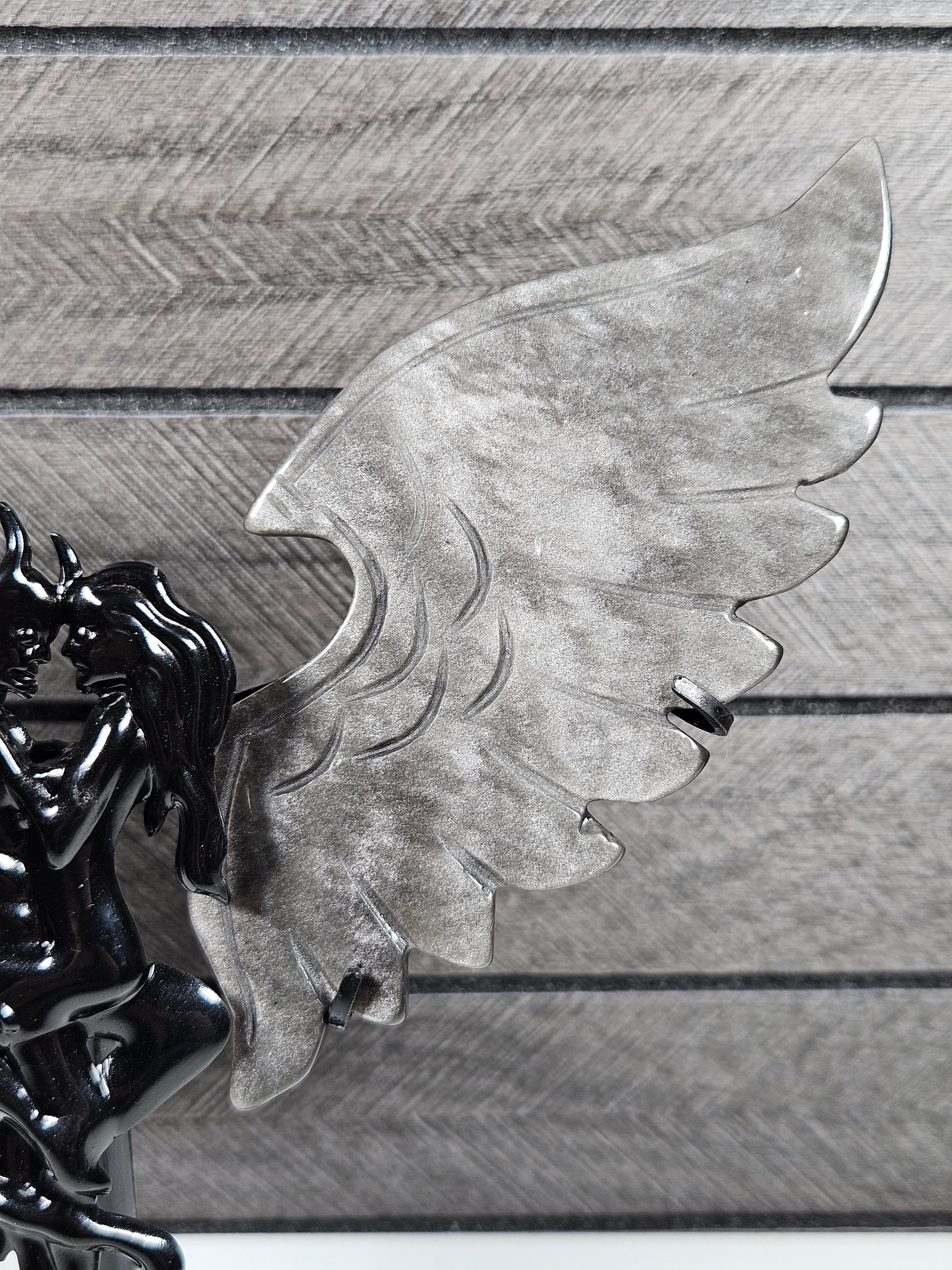 Dit Zilver Obsidiaan duivel en engel koppel D51 is een indrukwekkend en betekenisvol kunstwerk waarin licht en schaduw elkaar ontmoeten. De vleugels zijn prachtig vormgegeven en staan stevig op een elegante zwarte standaard. Met een breedte van ongeveer 18 cm en een hoogte van 17 cm heeft dit duo een krachtige en aanwezige uitstraling zonder overweldigend te zijn.
