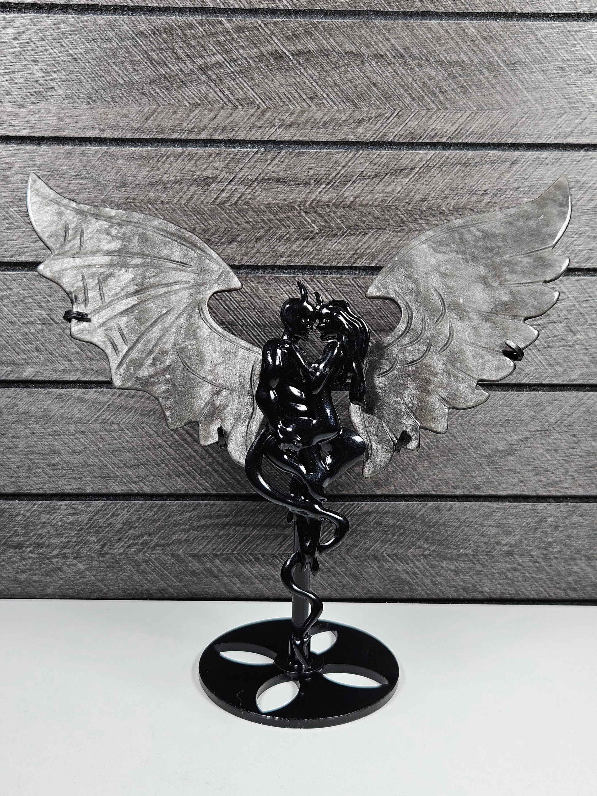In de vorm van dit duivel en engel koppel wordt die symboliek nog krachtiger, alsof het geheel je herinnert dat balans niet ontstaat door het ene weg te duwen, maar door alles te omarmen.