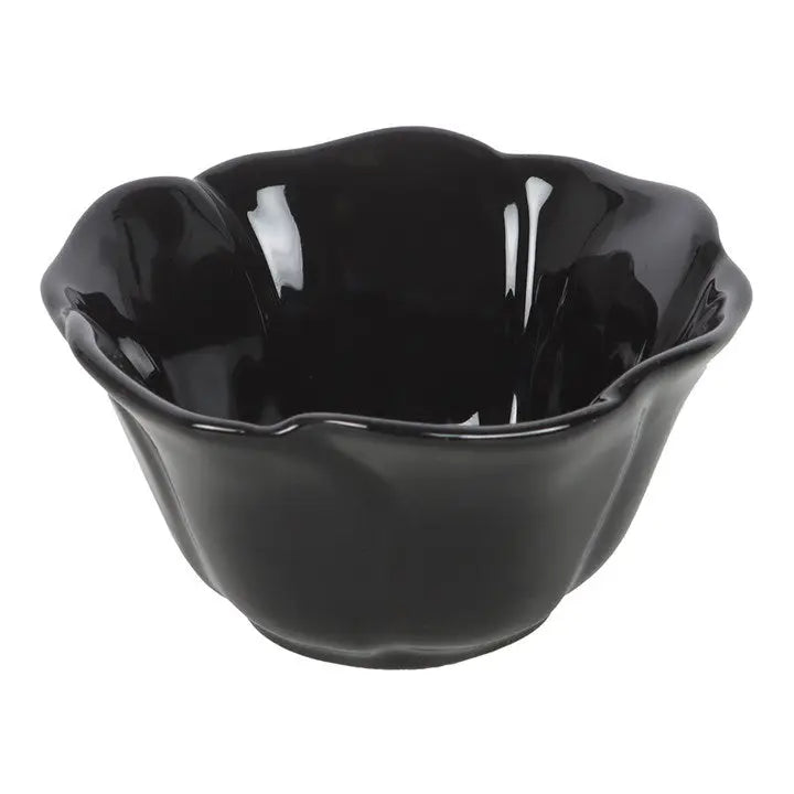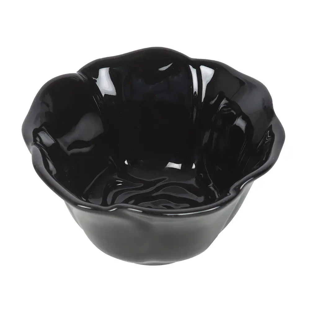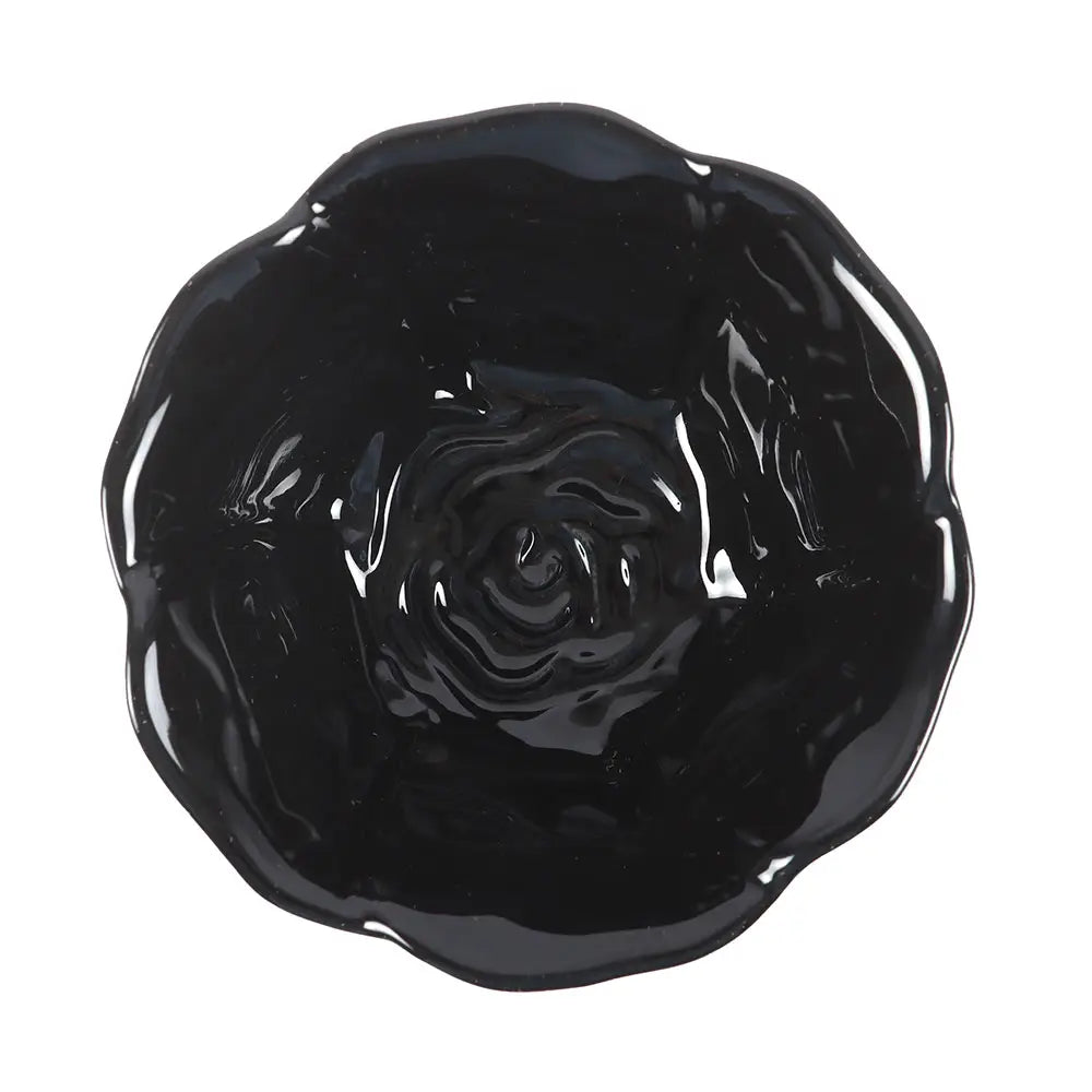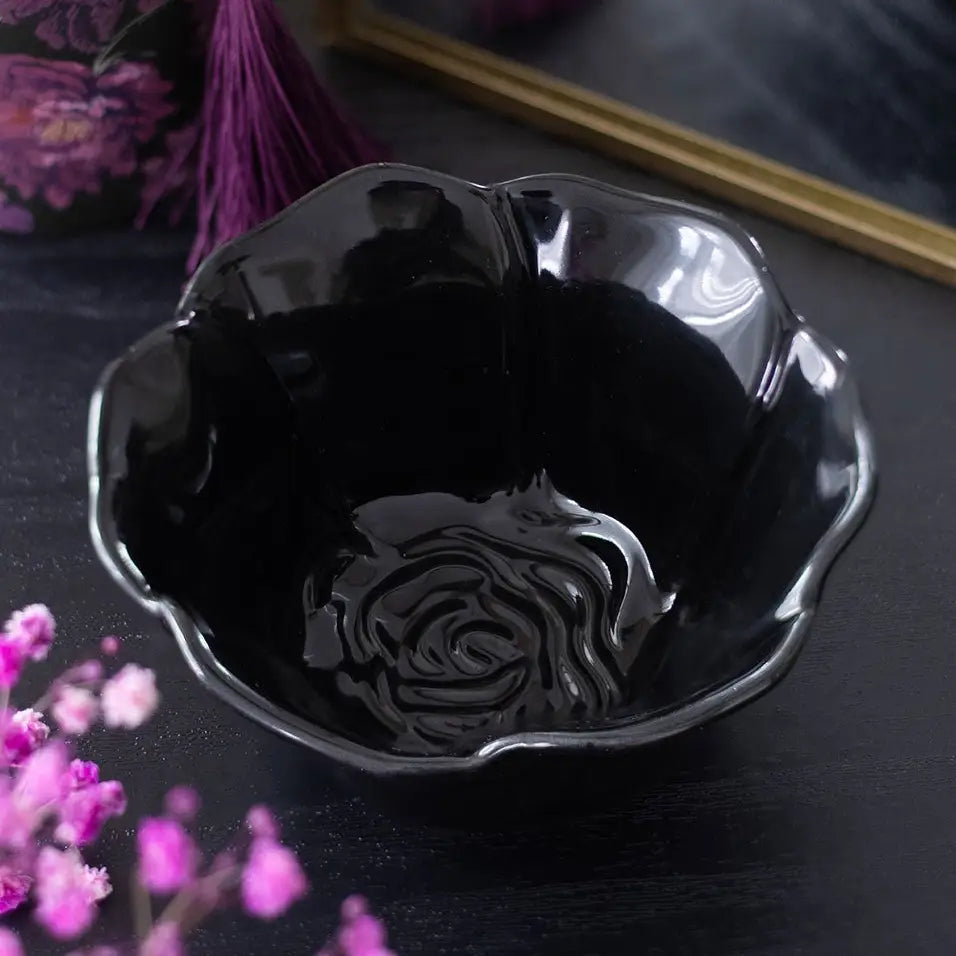 Het Zwarte Roos schaaltje is een elegant en poëtisch snuisterijenschaaltje, vormgegeven als een ontluikende zwarte roos. Dit keramische schaaltje biedt een stijlvolle plek om dierbare aandenkens, sieraden of kleine schatten te bewaren. Het verfijnde ontwerp en de diepe zwarte kleur geven het schaaltje een romantische, gotische uitstraling die perfect past op een kaptafel, nachtkastje of in een boudoir.