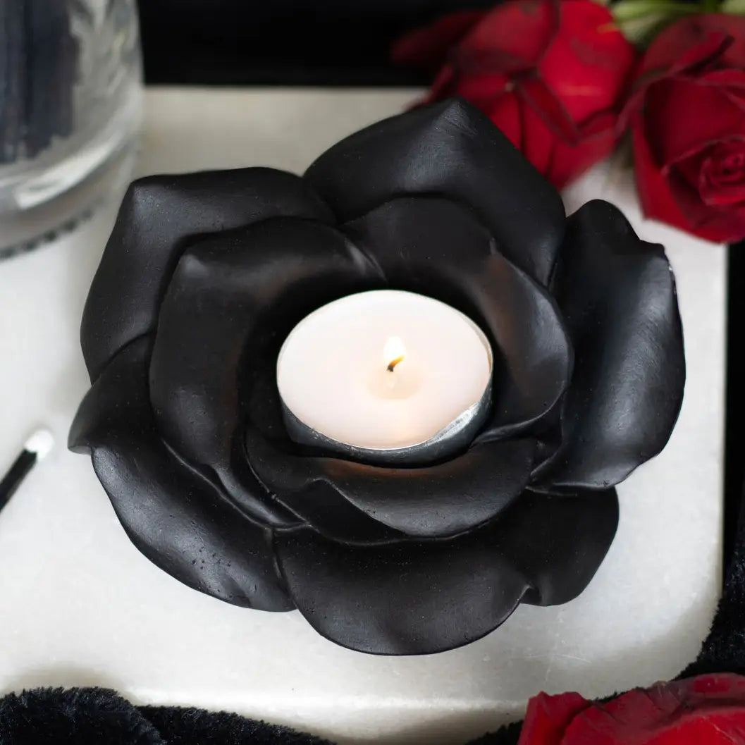 De diepe zwarte roos symboliseert mystiek, kracht en tijdloze schoonheid. Wanneer je een theelichtje plaatst, verspreidt het zachte kaarslicht zich tussen de bloemblaadjes en creëert het een warme, betoverende gloed. Perfect voor rituelen, meditatiemomenten of een sfeervolle avondsetting.