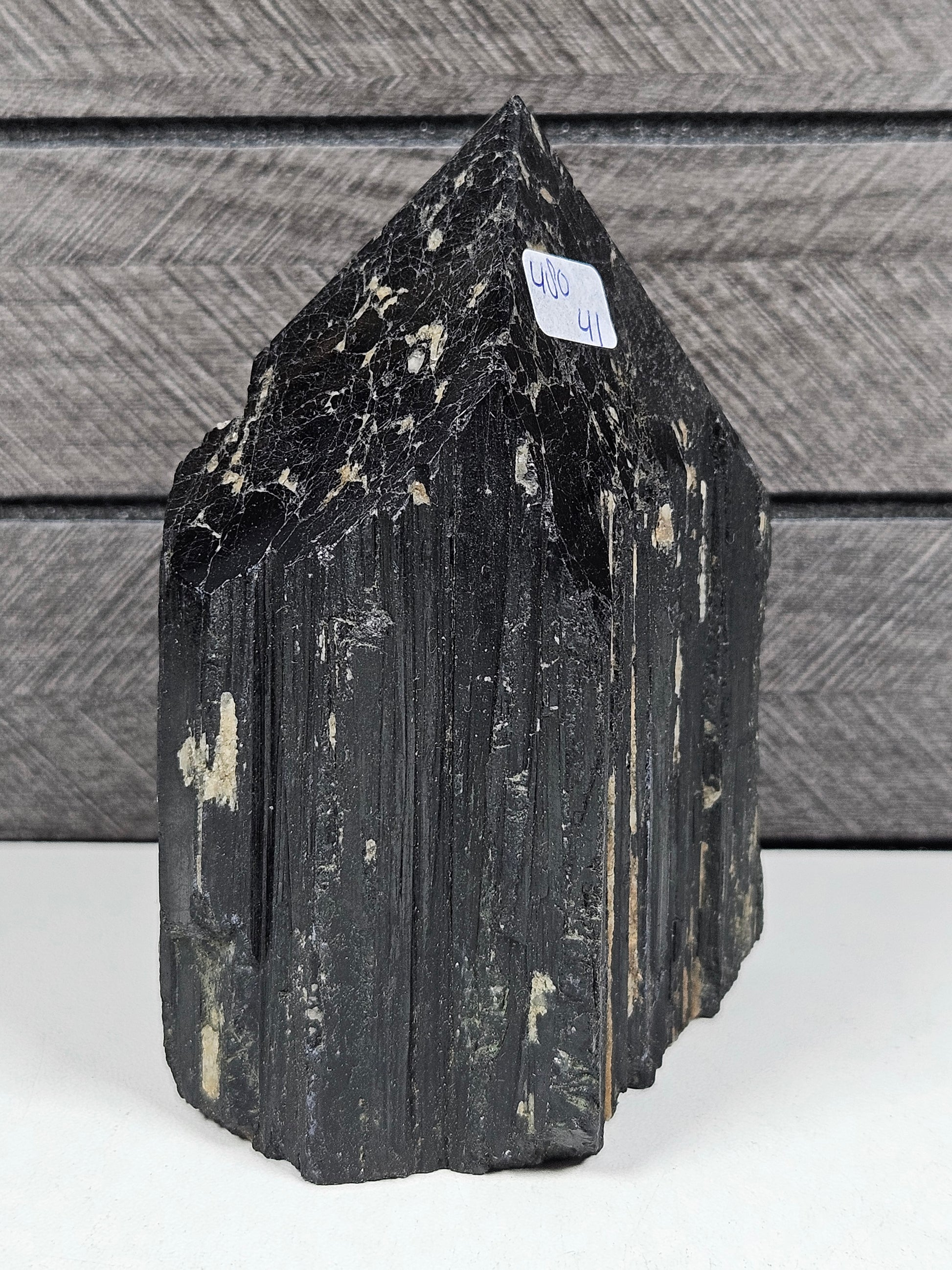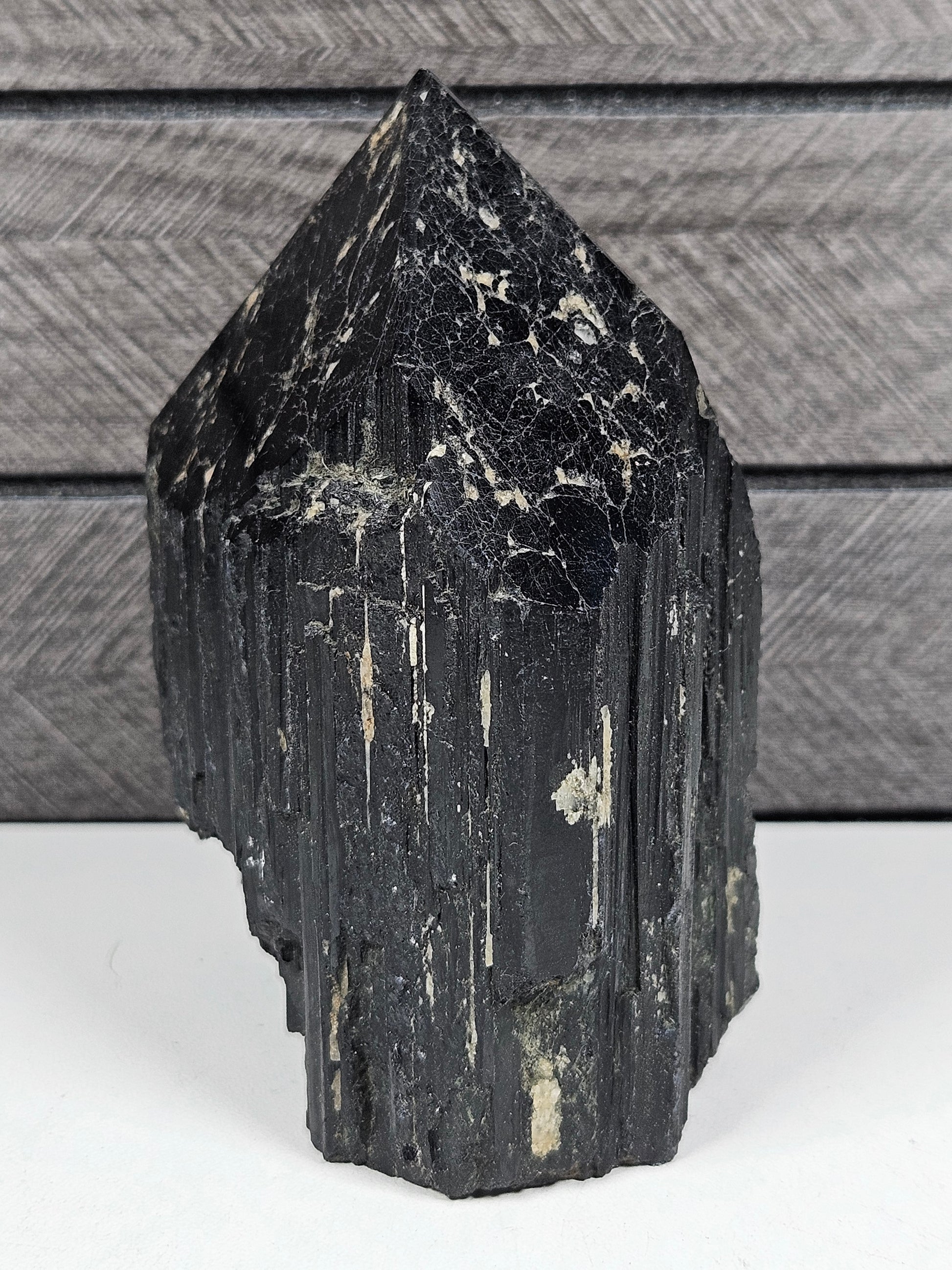 Deze zwarte toermalijn toren is een uniek stuk natuursteen. Structuur, vorm en details zijn volledig natuurlijk gevormd, waardoor elke toren een eigen karakter en uitstraling heeft. Je ontvangt precies het exemplaar dat op de foto staat.