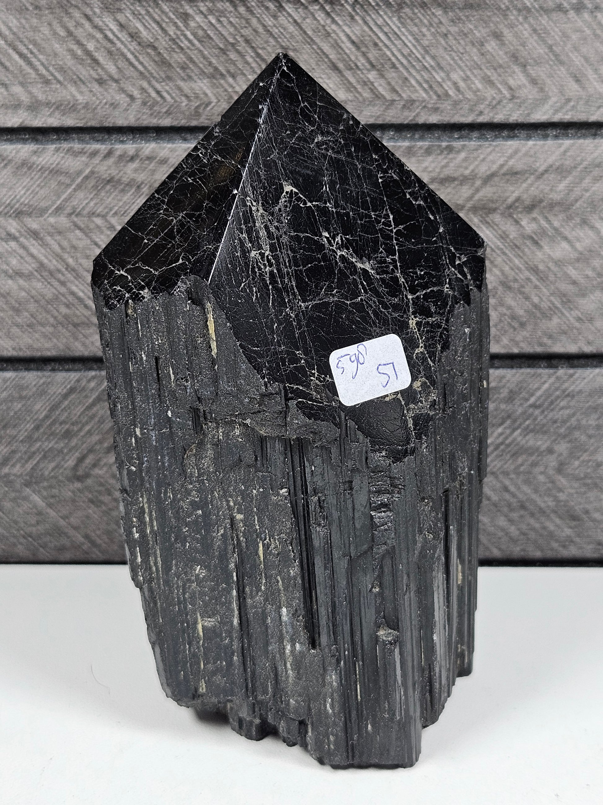 Deze krachtige zwarte toermalijn toren heeft een diepe, intense zwarte kleur met een robuuste en natuurlijke structuur. De verticale lijnen en ruwe details geven de steen een stoer en karaktervol uiterlijk. Dankzij de torenvorm wordt de energie van de steen versterkt en omhoog geleid, wat dit stuk zowel decoratief als energetisch bijzonder maakt.